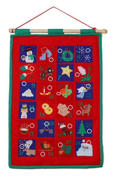 Räkna ner dagarna till julafton med denna fina Adventskalender som har både ringar och fickor så olika storlekar på paket fungerar. Röd med bilder som hör julen till.. Pinnen ingår. En kär kalender att plocka fram och använda i många år.