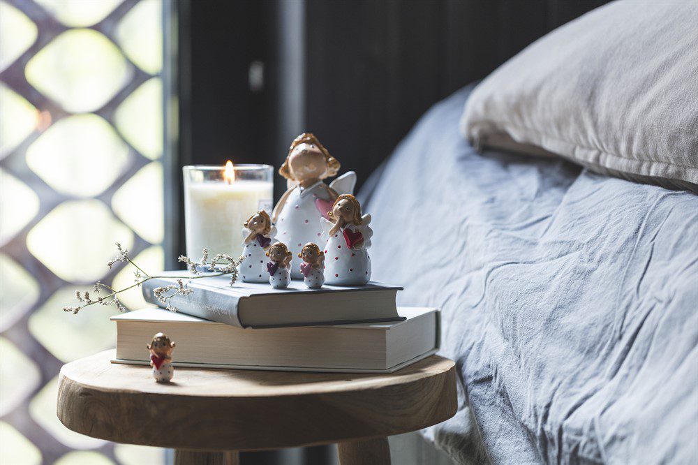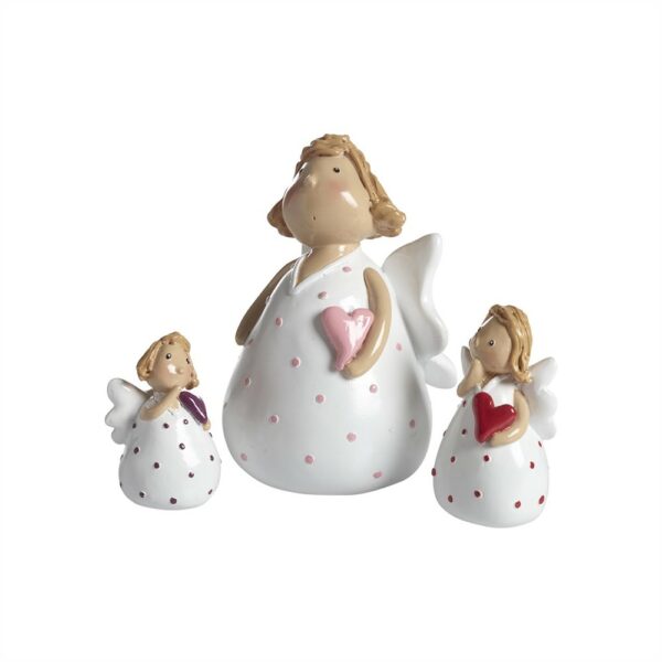 Den lilla ängeln som mäter 5 cm har en vit klänning med lila prickar och ett lika hjärta. Den mellanstora ängeln mäter 6,8 cm och har en vit klänning med röda prickar och ett rött hjärta. Den största av änglarna mäter 12 cm och har en vit klänning med rosa prickar och ett rosa hjärta. Köp änglarna var för sig eller alla tre till paketpris 349 kr (ord. pris 377 kr)