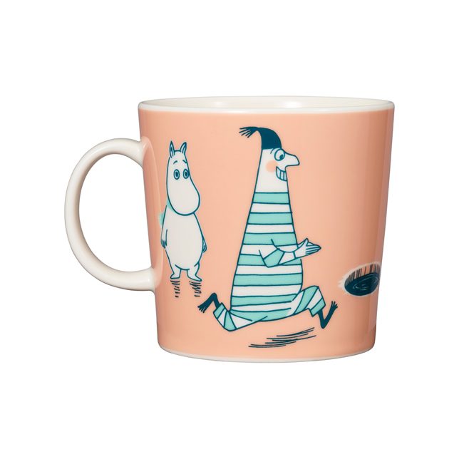 Muggen med bokstaven E pryds av Mymlan på ena sidan och andra sidan ses idrottsentusiasten Herr Brisk. Hans ständiga sportande imponerar inte på Mumintrollen, men för Mymlan är det kärlek vid första ögonkastet. Illustrationen på muggen är inspirerad av serien “Den farliga vintern”.