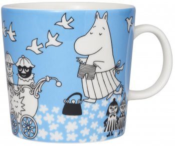Illustrationen på muggen visar Mumintrollen och piraterna som lever tillsammans i fred och frihet i Mumindalen. Bilderna är baserade på Janssons vykort från 1982 och en scen ur muminserien Den ensliga ön från 1955. Muminmugg stor, Blå, lanserades först 1996 och finns nu i en ny efterlängtad storlek som rymmer 0,4 L.