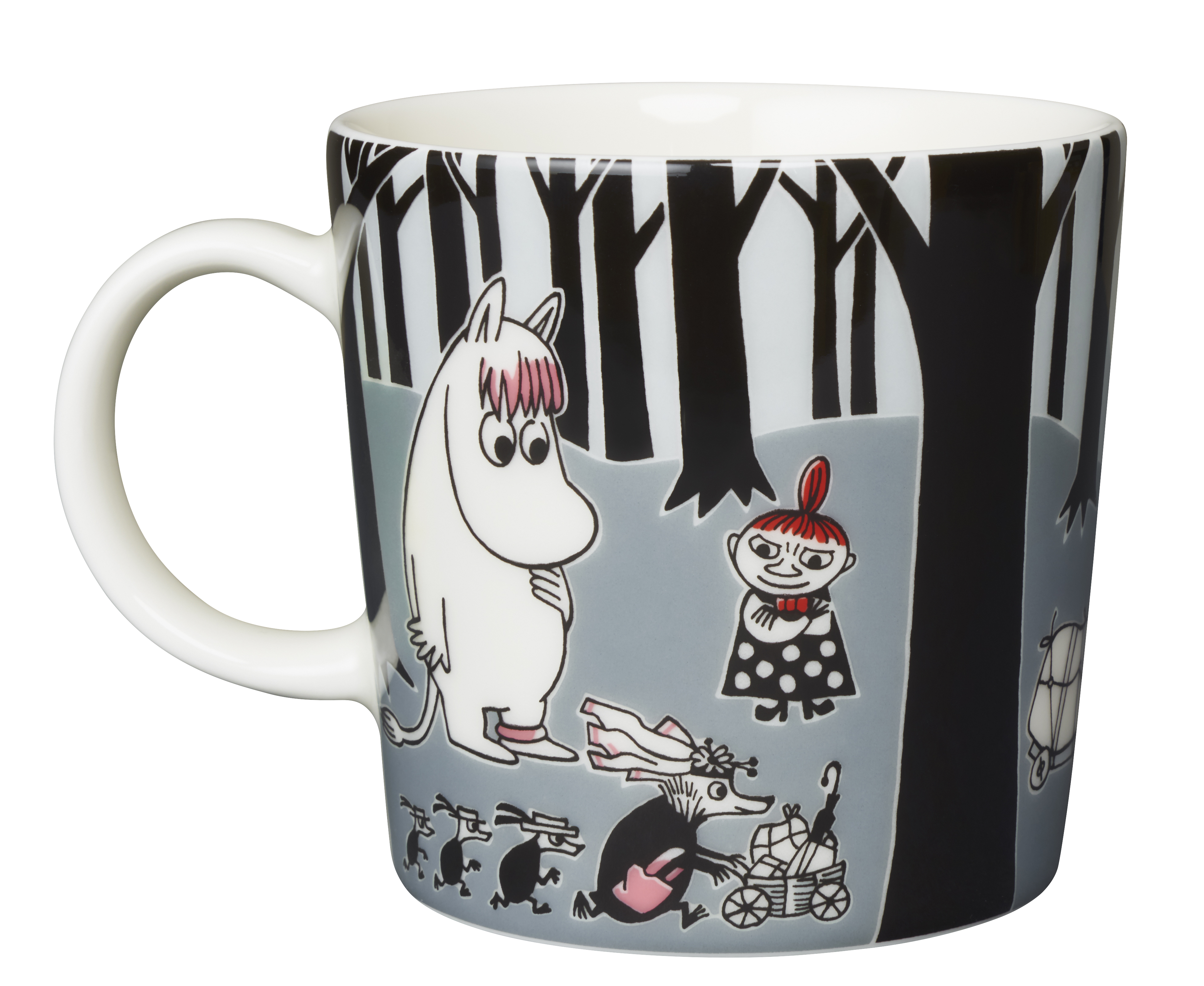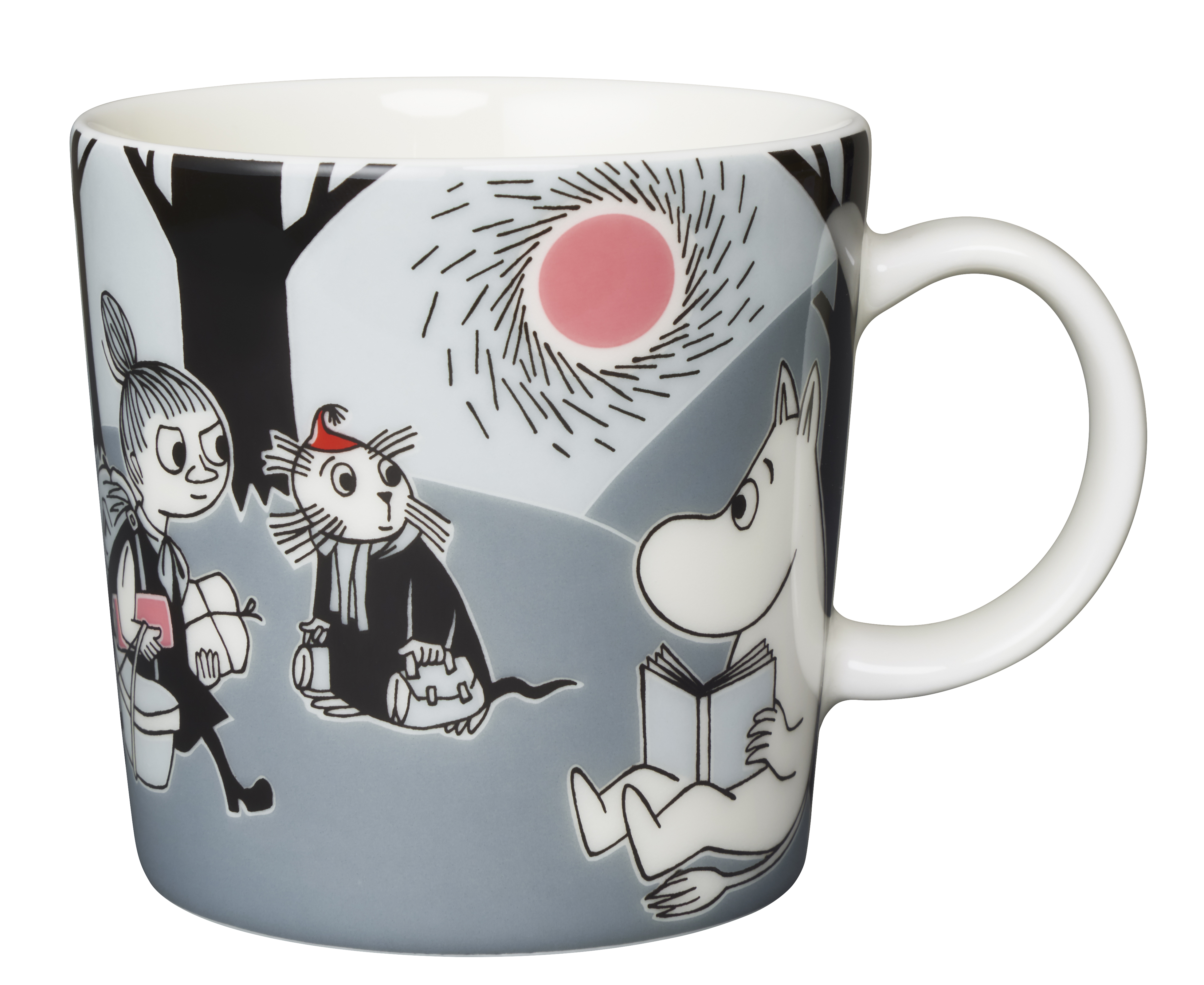 ”Tusen snygg” mugg säger barnen hemma om vår mugg Äventyr, Flytten. Muminmugg i grå och rosa toner. Mumin porslinsmugg från Arabia. 3 dl.