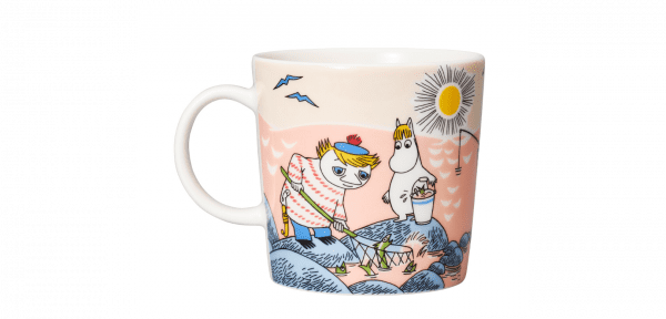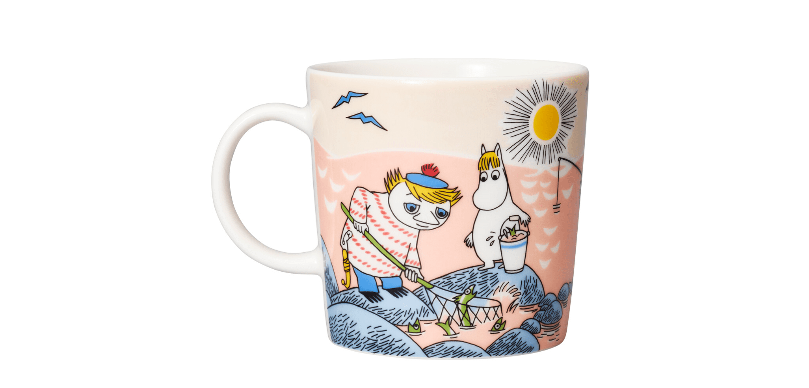 Arabias säsongsmugg och samlarmugg visar ett fint motiv med muminfamiljen som en härlig sommardag fiskar tillsammans med vännerna Too-Ticki och Snusmumriken. Muggen är inspirerad av tre olika berättelser och gjorde i en speciell collageteknik.