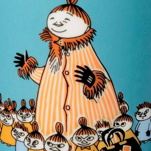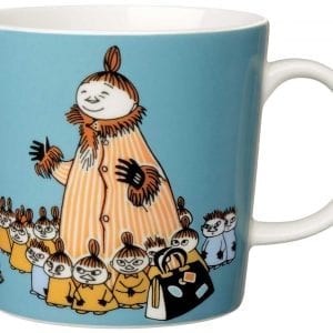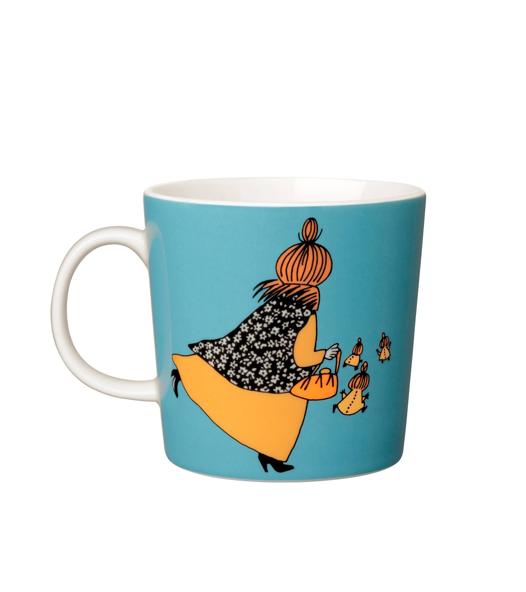 Turkos muminmugg i porslin med Mymlans Mamma och hennes barn, från Arabia. Rymmer ca 3 dl.