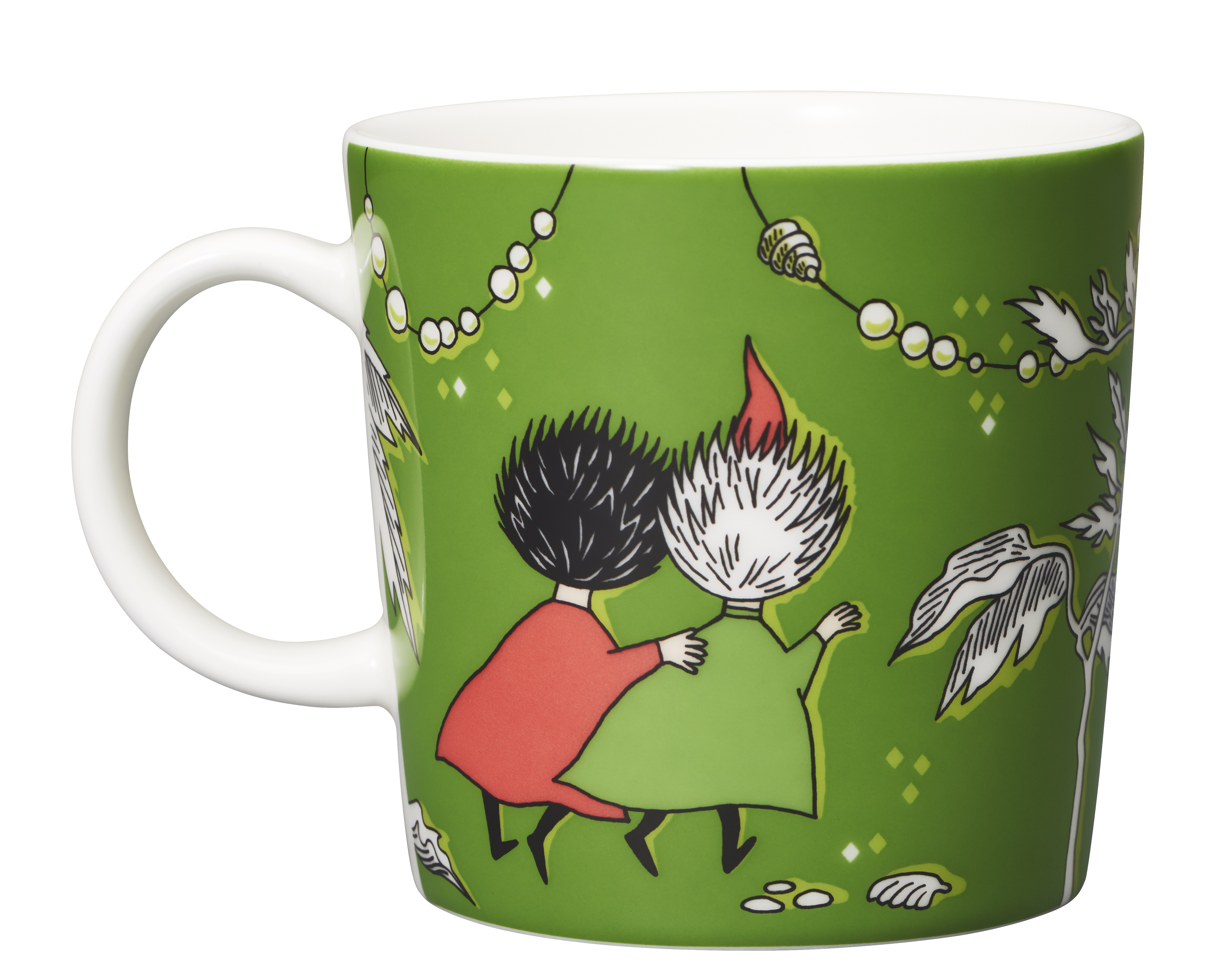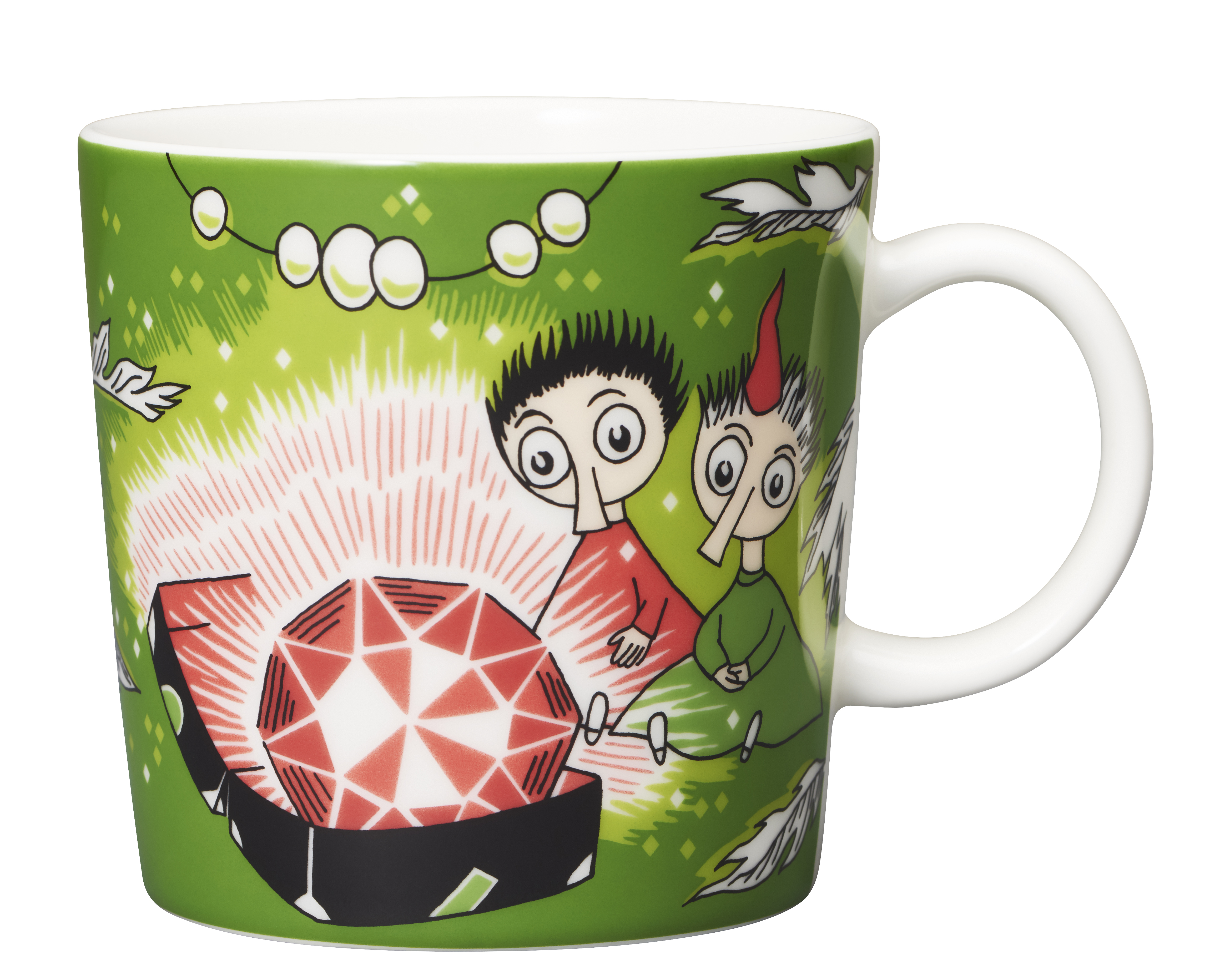 Fin Muminmugg i härliga färger från Arabia. Rymmer 3 dl. Tofslan och Vifslan gömmer den stora röda kungsrubinen i sin resväska.