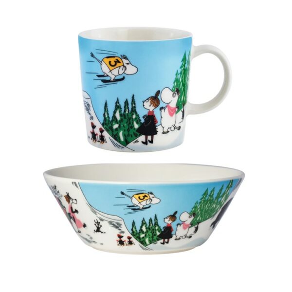 Arabia Muminserie –Backhoppning – Mugg och skål i vinterns motiv, olika motiv på fram och baksida på både mugg och skål.