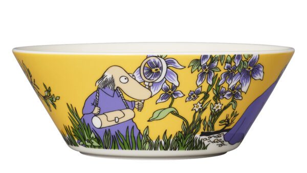 Fin skål i gult med Hemulen där han ses i skogen letandes okända växter.