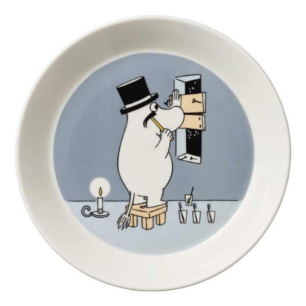 Fin porslinstallrik med Muminpappan som förbereder sin familj inför vintern. 19 cm i diameter.