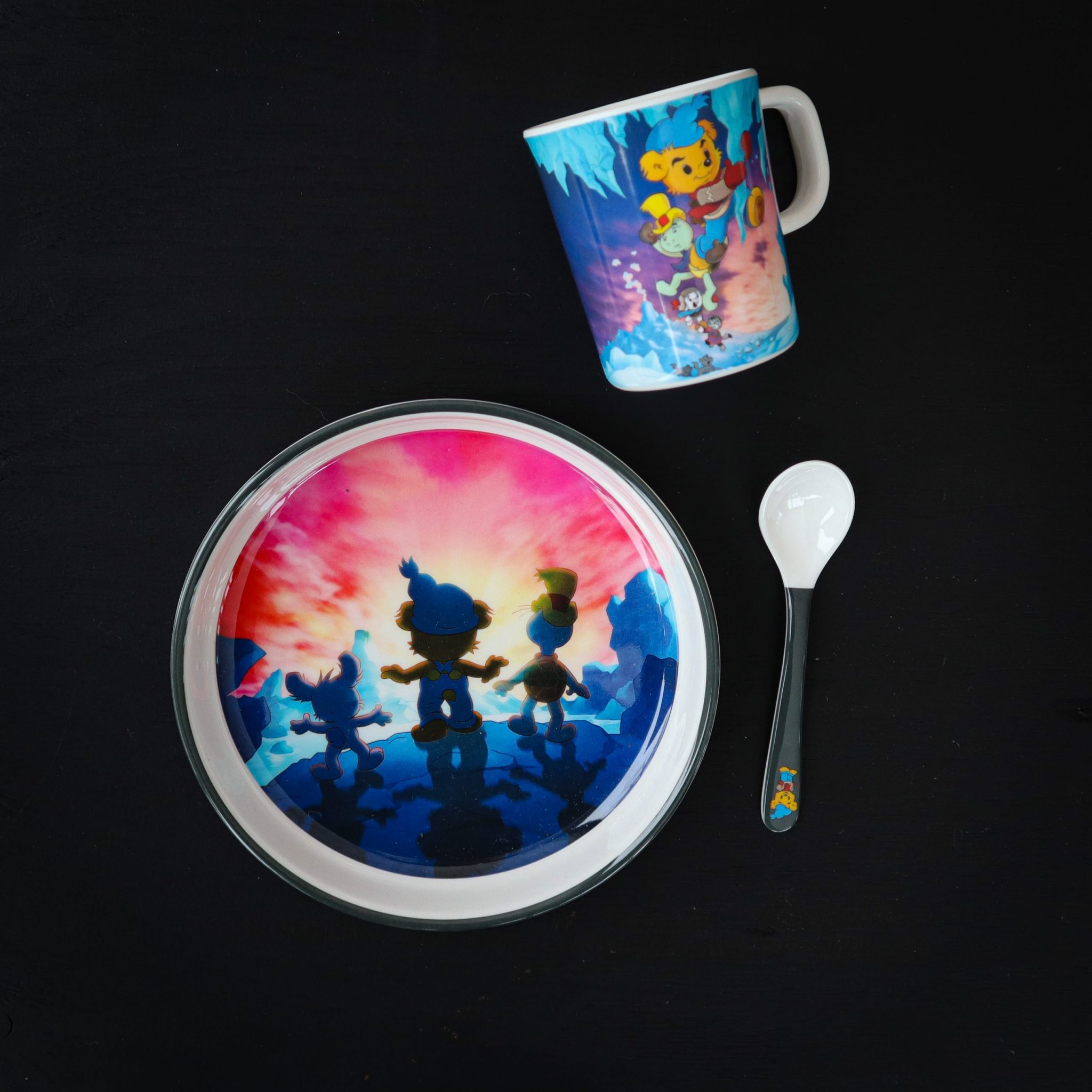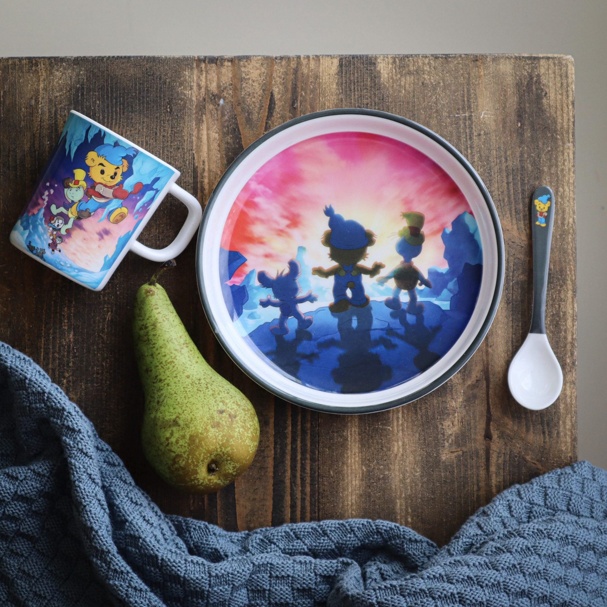 Superfint set, Bamse Barnservis, Vulkanön. Innehåller mugg med handtag, flat tallrik med kant, samt en sked. Perfekt när barnet ska börja äta själv. Fin present!