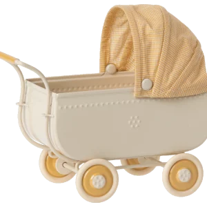 Ljuvlig retroinspirerad vagn Maileg, passar fint till Mailegs möss och kaniner i storlek micro/baby. Cremecvit liggvagn med gula detaljer och sufflett och gulligt bäddset.