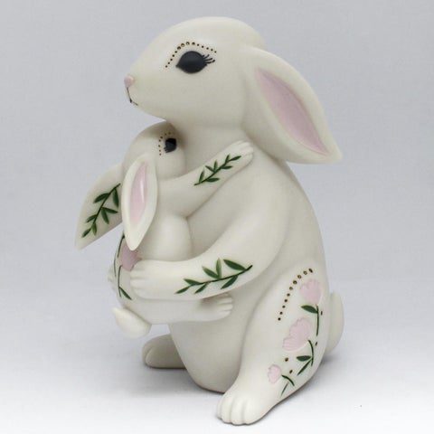 Kaninen är vit med fina detaljer i rosa, grönt och guld.