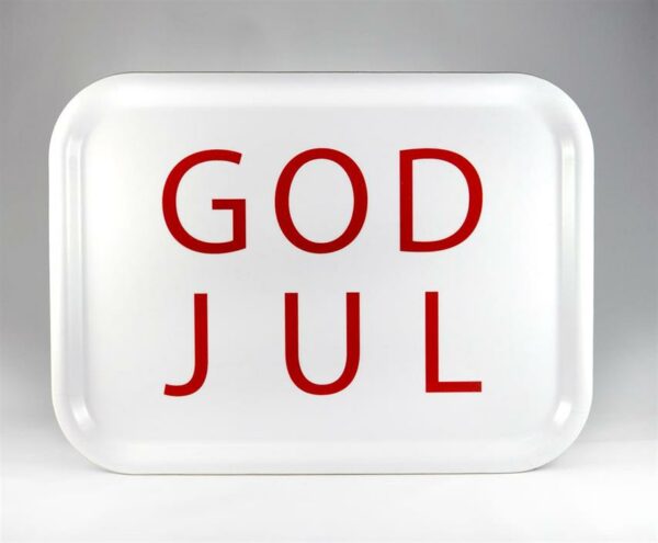 Vit bricka med röd text, tydligt, enkelt och fint. Bricka – God Jul, från Mellow Design.