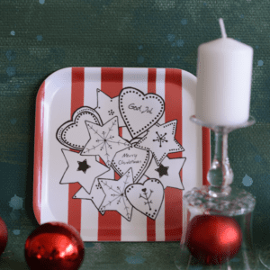 Fin bricka med pepparkaksmönster och texten ”God Jul” och ”Merry Christmas”. På brickans baksida står det ”God Jul på 6 olika språk. Perfekt bricka/kakfat/bullfat för julens godsaker. Trevlig present att skicka till vännen som bor utomlands. Det finns en matchande disktrasa att köpa till som du hittar här.
