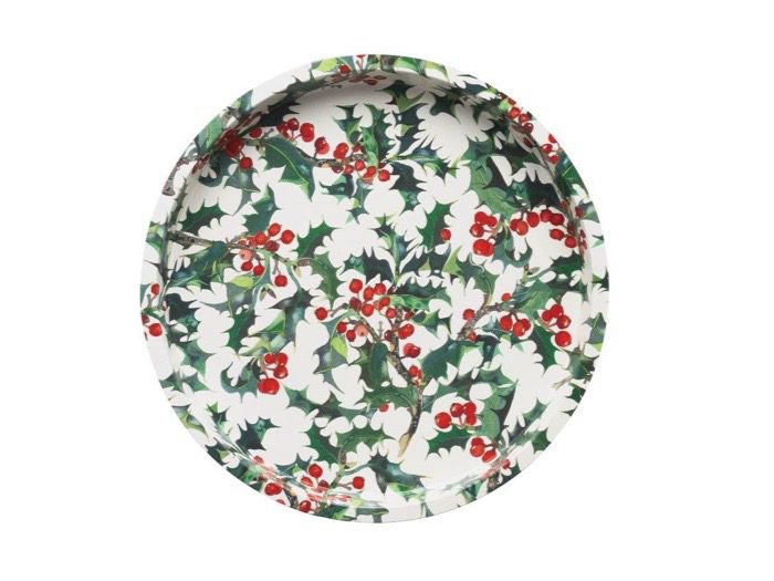 Rund bricka i plåt med vackert motiv med gröna mistlar och röda bär. Här bär du fram julens godsaker och får samtidigt en fin och stämningsfull inredningsdetalj i ditt hem. Diameter 30 cm.