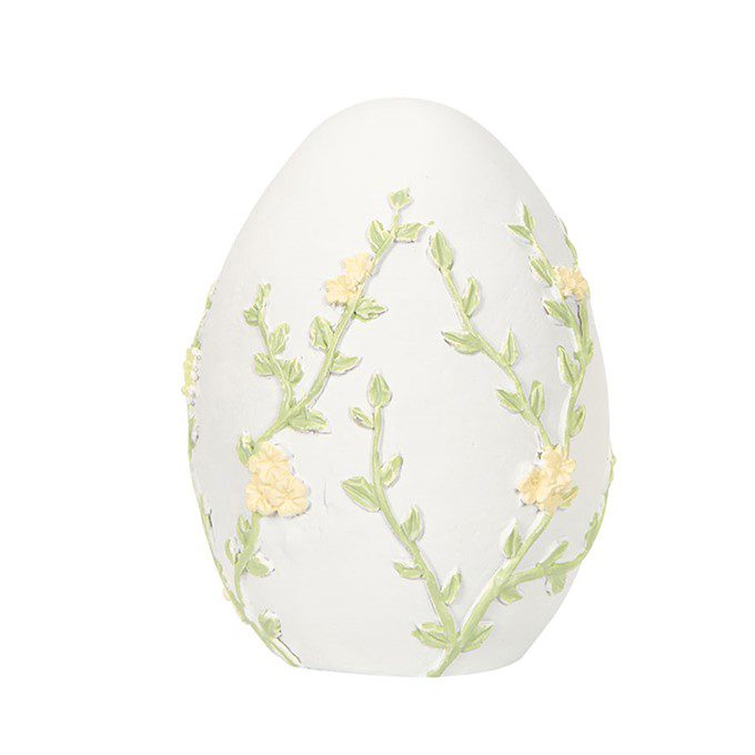 Söta ägg med blomsterdekoration i 2-pack. Ställ dem på bordet och påskdukningen blir lite extra fin. Passar också fint i ett fönster och tillsammans med påskharen. Fint pynt när vi längtar efter våren. Två vita ägg med gröna blad och gula små blommor.