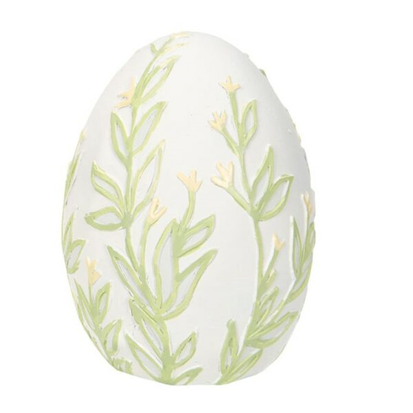 Söta ägg med blomsterdekoration i 2-pack. Ställ dem på bordet och påskdukningen blir lite extra fin. Passar också fint i ett fönster och tillsammans med påskharen. Fint pynt när vi längtar efter våren. Två vita ägg med gröna blad och gula små blommor.