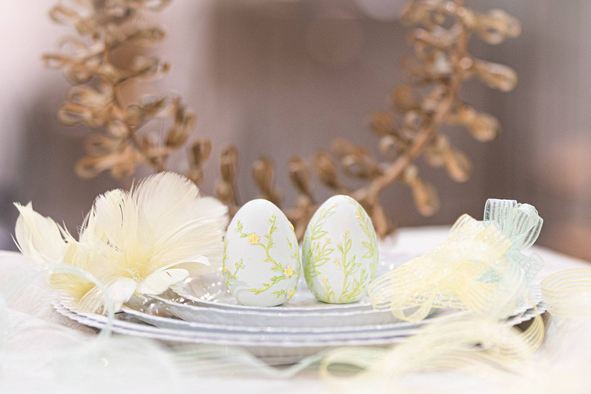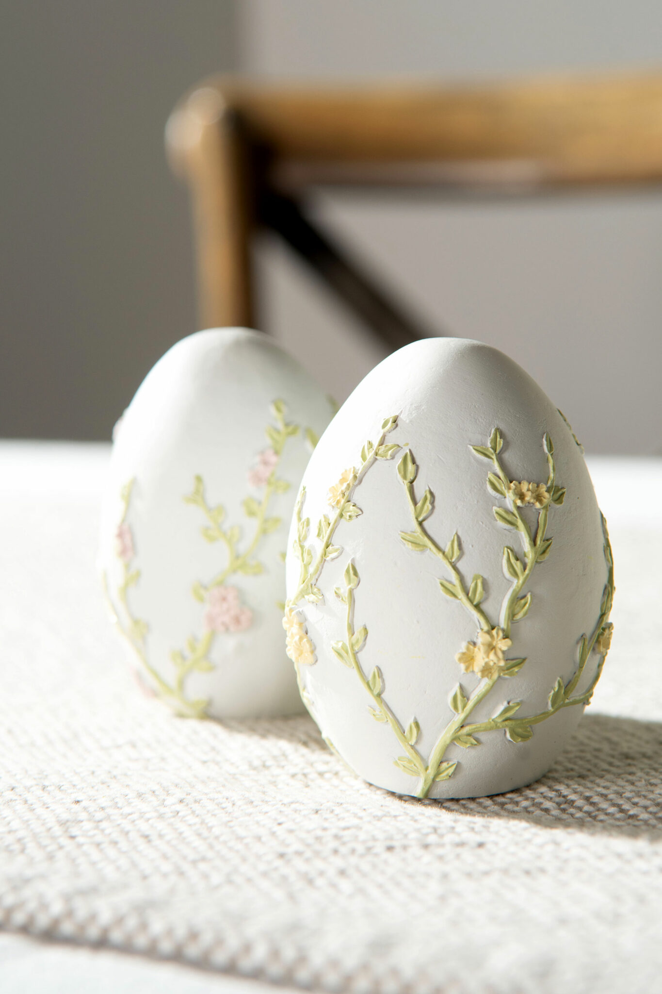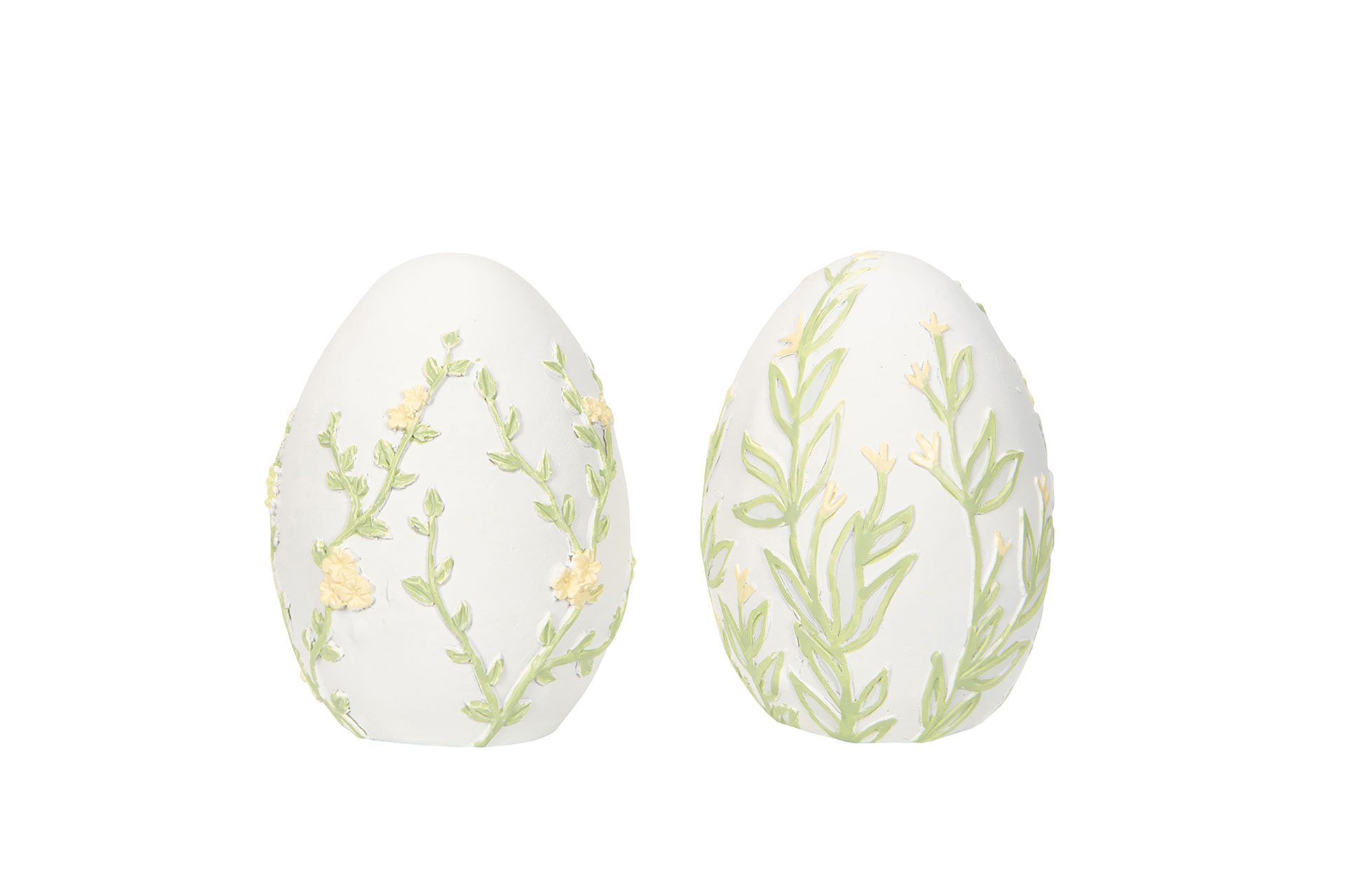 Söta ägg med blomsterdekoration i 2-pack. Ställ dem på bordet och påskdukningen blir lite extra fin. Passar också fint i ett fönster och tillsammans med påskharen. Fint pynt när vi längtar efter våren. Två vita ägg med gröna blad och gula små blommor.
