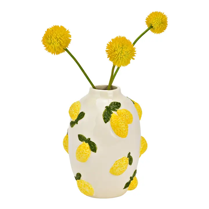 Tillverkad i högkvalitativ keramik är vasen både hållbar och stabil, vilket gör den till en praktisk och dekorativ detalj i vardagen. Den cremevita basen tillsammans med citronerna skapar en mjuk, varm och solig känsla i rummet.