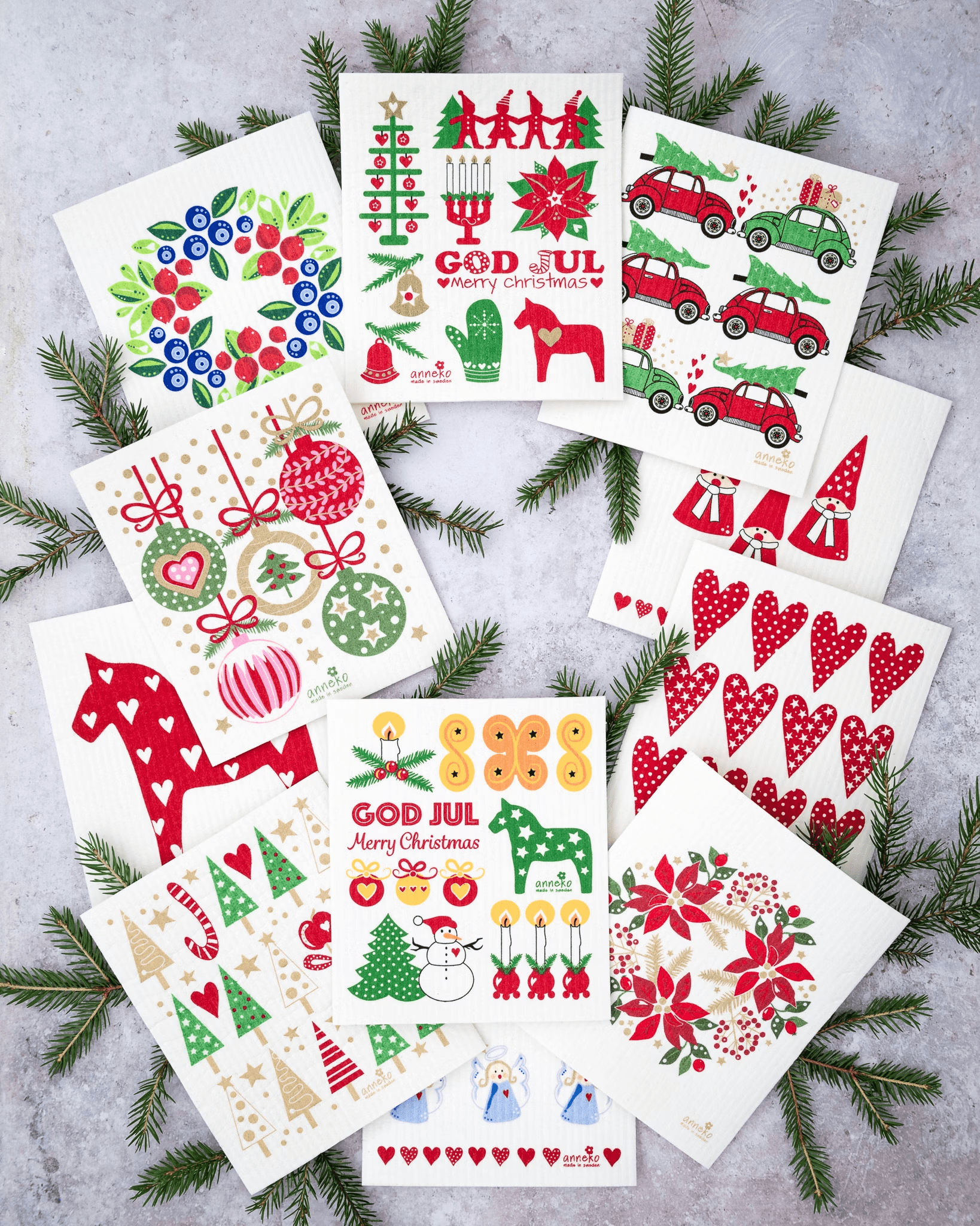 Fin disktrasa i Anneli Asplunds design, Anneko Design. Miljövänlig disktrasa med designat tryck, fin disktrasa med klassiska bubblor i härliga färger, lastade med granar och paket. Det blir inte roligare att städa för att man har en fin disktrasa, men lite gladare blir man varje gång den åker fram!