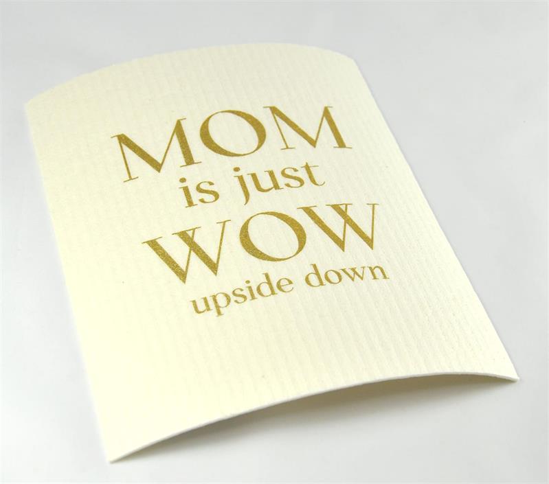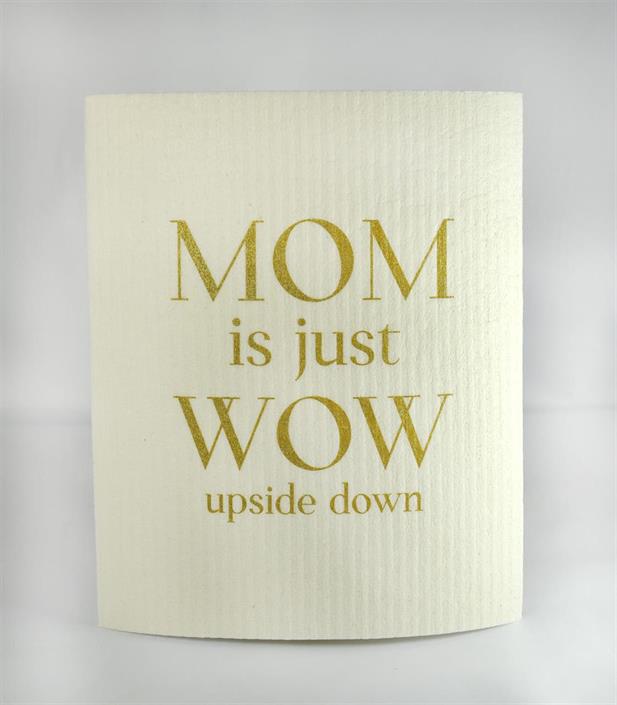 Disktrasa till alla fantastiska mammor MOM is just WOW upside down.P erfekt gå-borts-present, eller rolig detalj i ditt kök. Vit disktrasa med guldfärgad text.