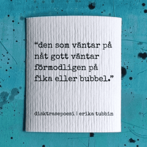 Disktrasa med texten ”den som väntar på något gott väntar troligen på bubbel eller fika.” Perfekt gå-borts-present, och rolig detalj i ditt kök. Ge istället för en blomma eller kort.