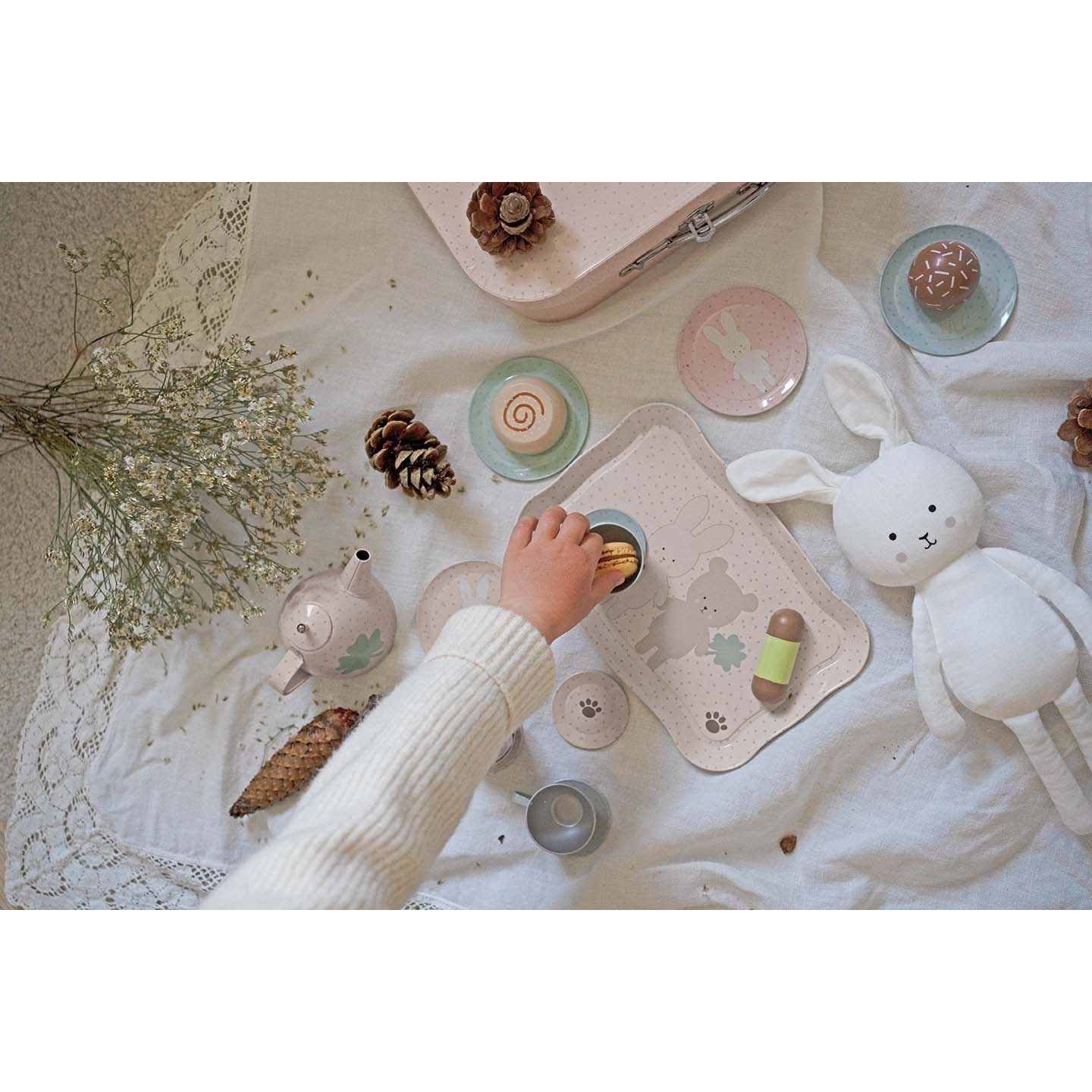 Plåt är suveränt bra material för dockserviser när man är liten, den tål att bli tappad i golvet om och om igen utan att gå sönder. Barn har i alla tider tyckt om att bjuda vuxna på mat och på fika. Kakor och tårta är alltid lika gott tycker barn och vill gärna servera det till kaffet eller teet. Du hittar våra övriga dockserviser här.