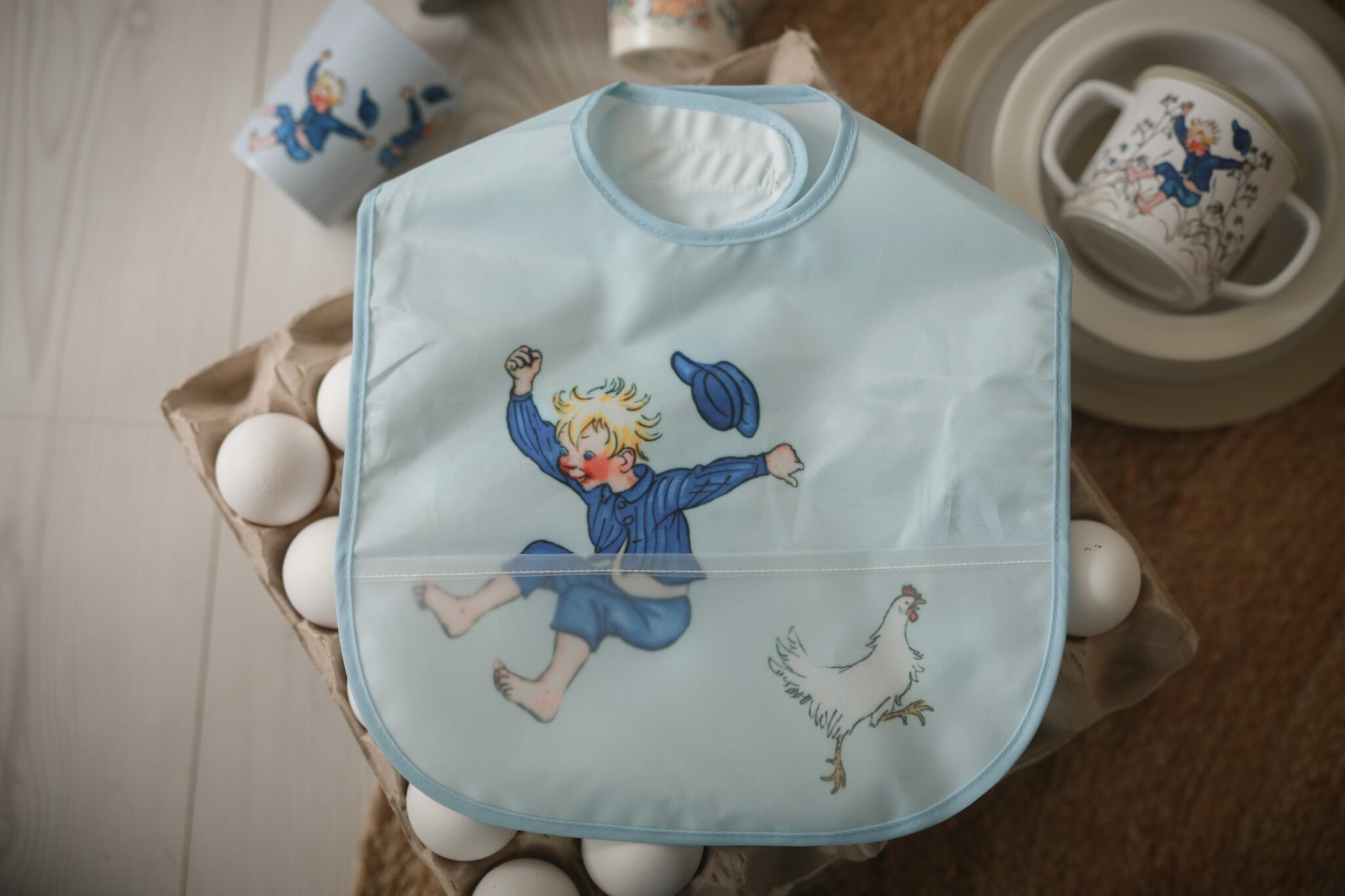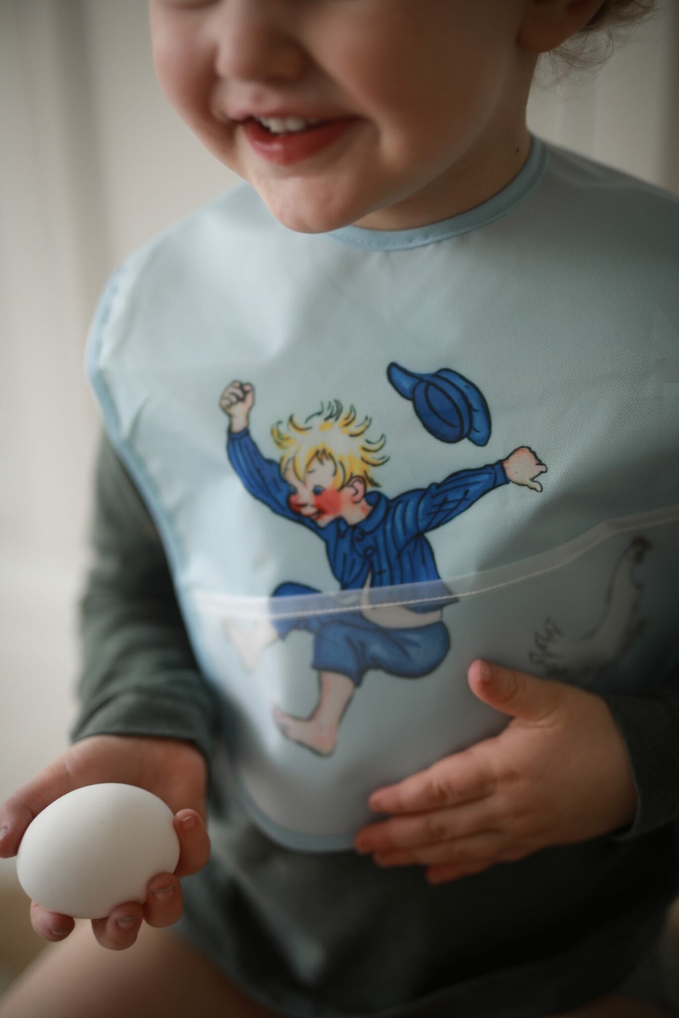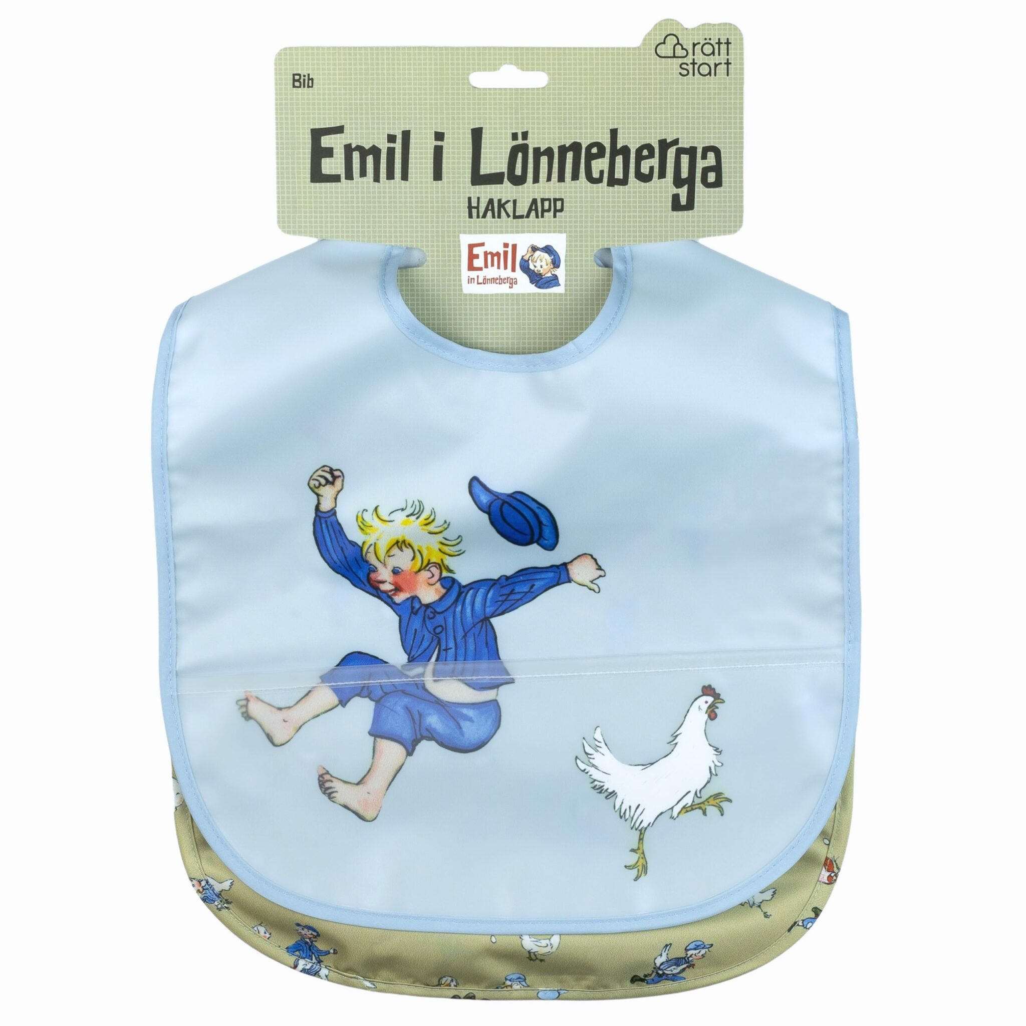Praktiska haklappar med spillficka i 2-pack. Två haklappar med olika motiv. På den ena syns Emil med en höna. På den andra syns både Emil och Ida som samlar ägg. Det är roligt med mat! Men i början är det inte alltid så lätt, ibland är det ovant, ibland äckligt och ibland så gott att man bara måste skratta. Det är lätt att maten hamnar lite här och där. Spillfickan samlar upp en del av maten som annars skulle hamna på golvet. Lätt att skölja av, torkar snabbt knäpps  med kardborreknäppning.