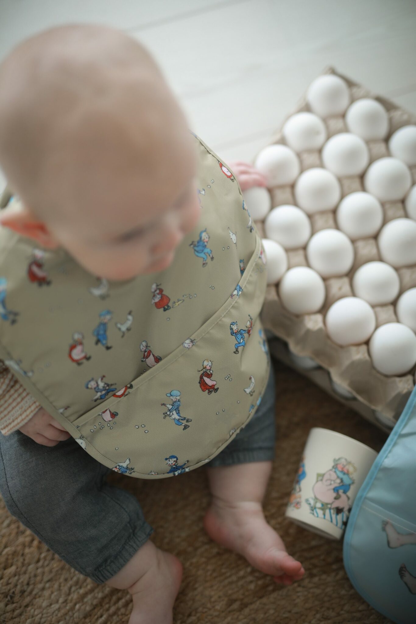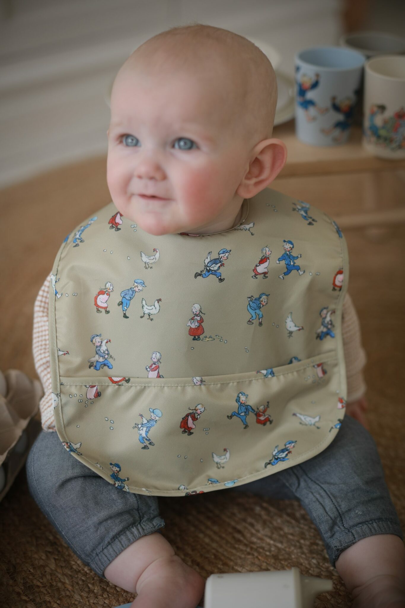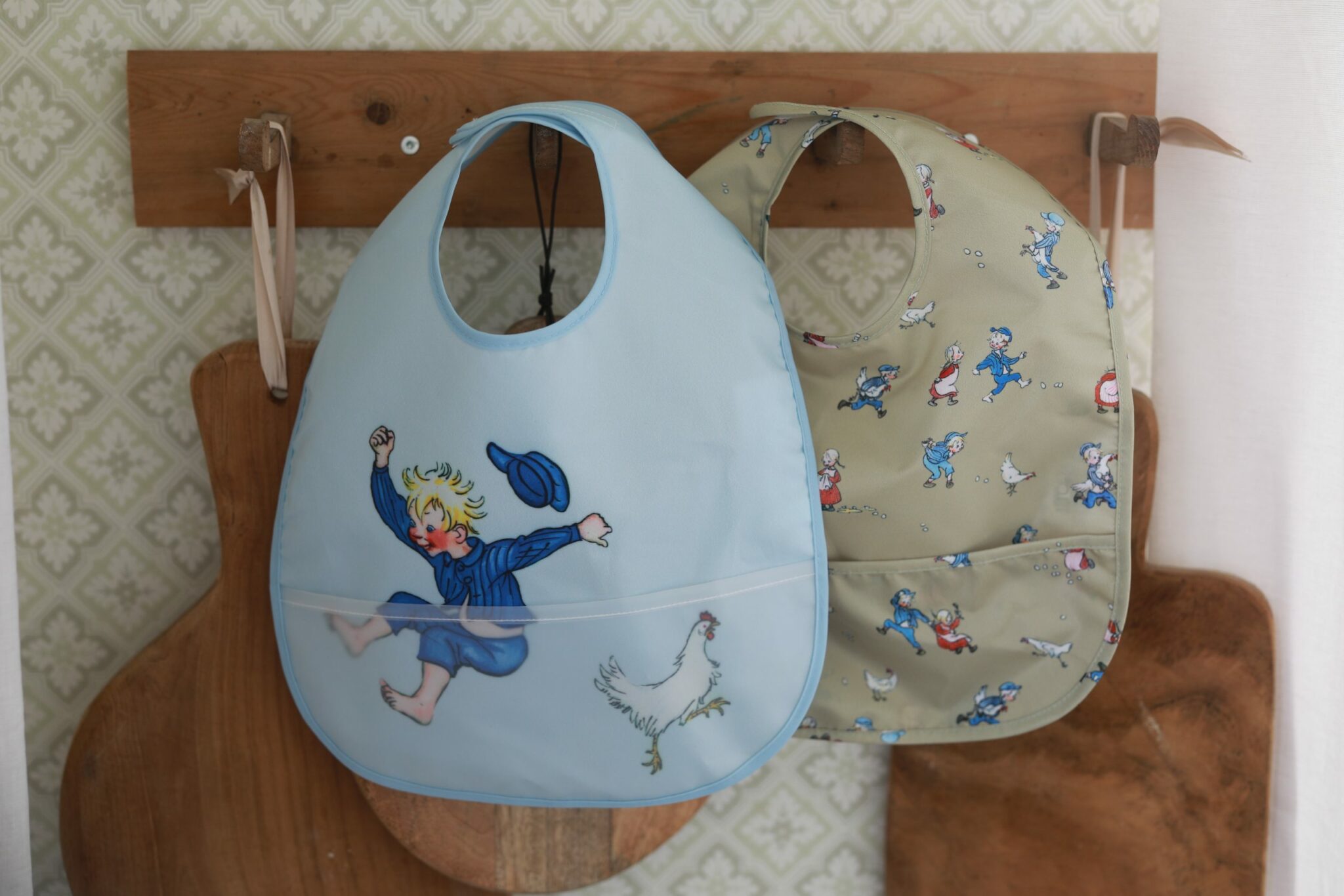 Praktiska haklappar med spillficka i 2-pack. Två haklappar med olika motiv. På den ena syns Emil med en höna. På den andra syns både Emil och Ida som samlar ägg. Det är roligt med mat! Men i början är det inte alltid så lätt, ibland är det ovant, ibland äckligt och ibland så gott att man bara måste skratta. Det är lätt att maten hamnar lite här och där. Spillfickan samlar upp en del av maten som annars skulle hamna på golvet. Lätt att skölja av, torkar snabbt knäpps  med kardborreknäppning.