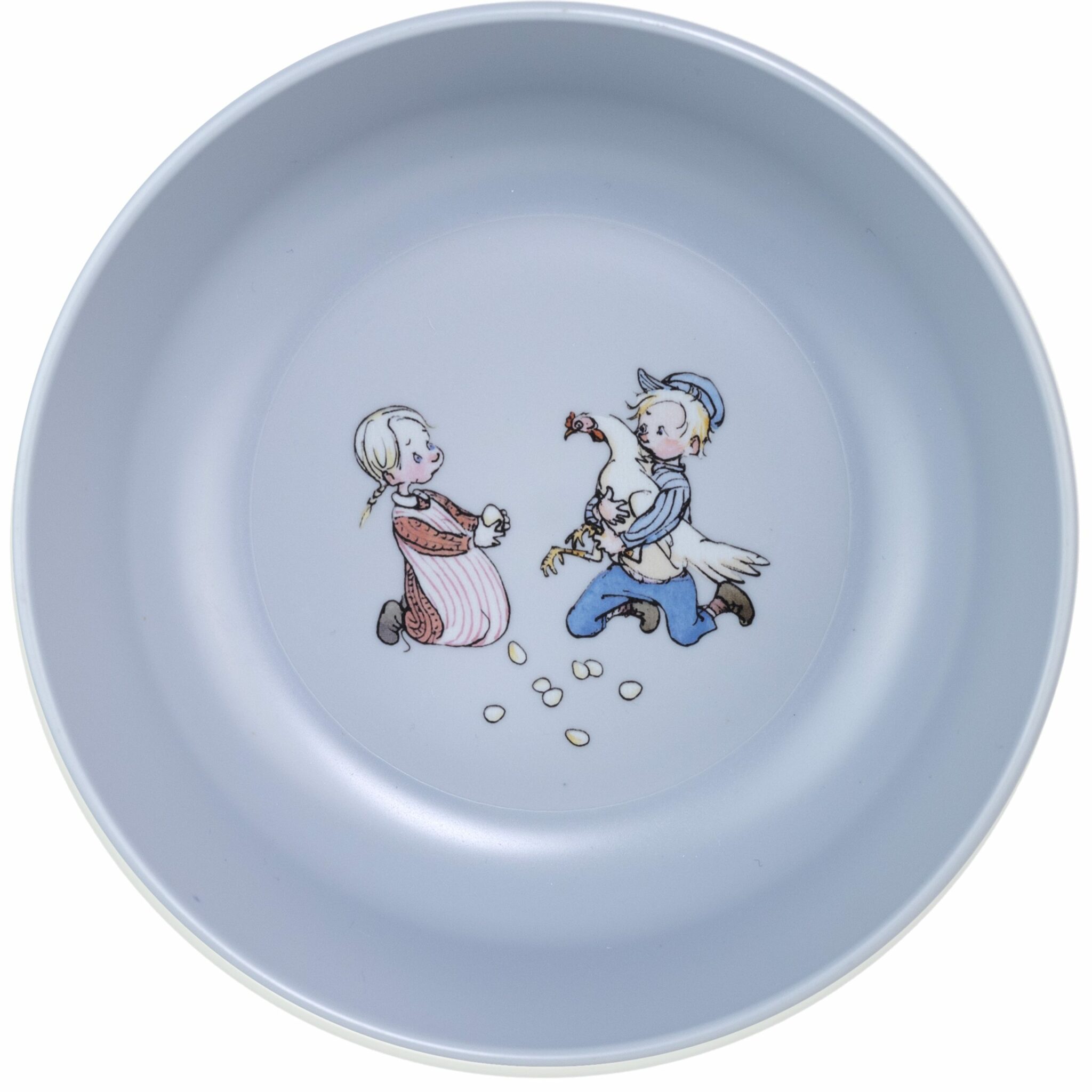 Härligt och glatt mönster på praktisk djup tallrik från Rätt Start. Tillverkad i RPET. Perfekt när det är dags för barnet att börja prova smakportioner eller äta själv. Här ses Emil tillsammans med Ida, då de samlar ägg och håller i en höna.