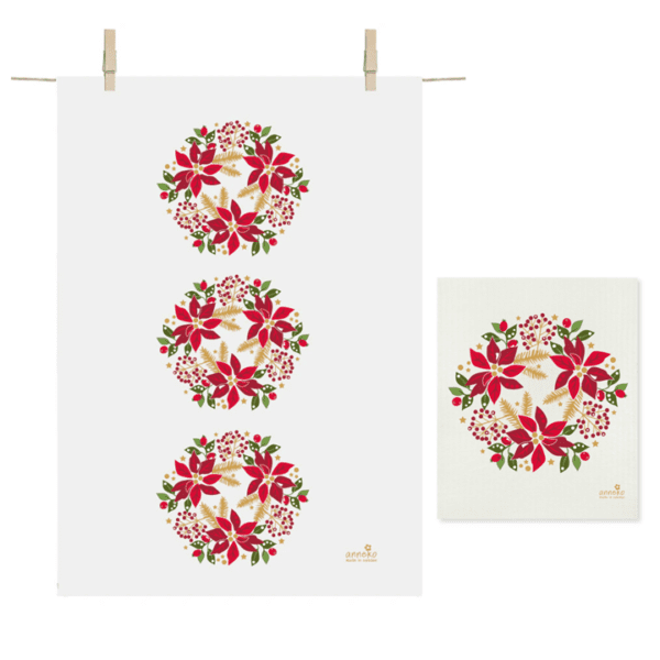 Fint presentset som innehåller kökshandduk och disktrasa i mönstret Julkrans, en krans i rött av julens blommor. Ge bort eller köp själv – fin färgklick i köket!