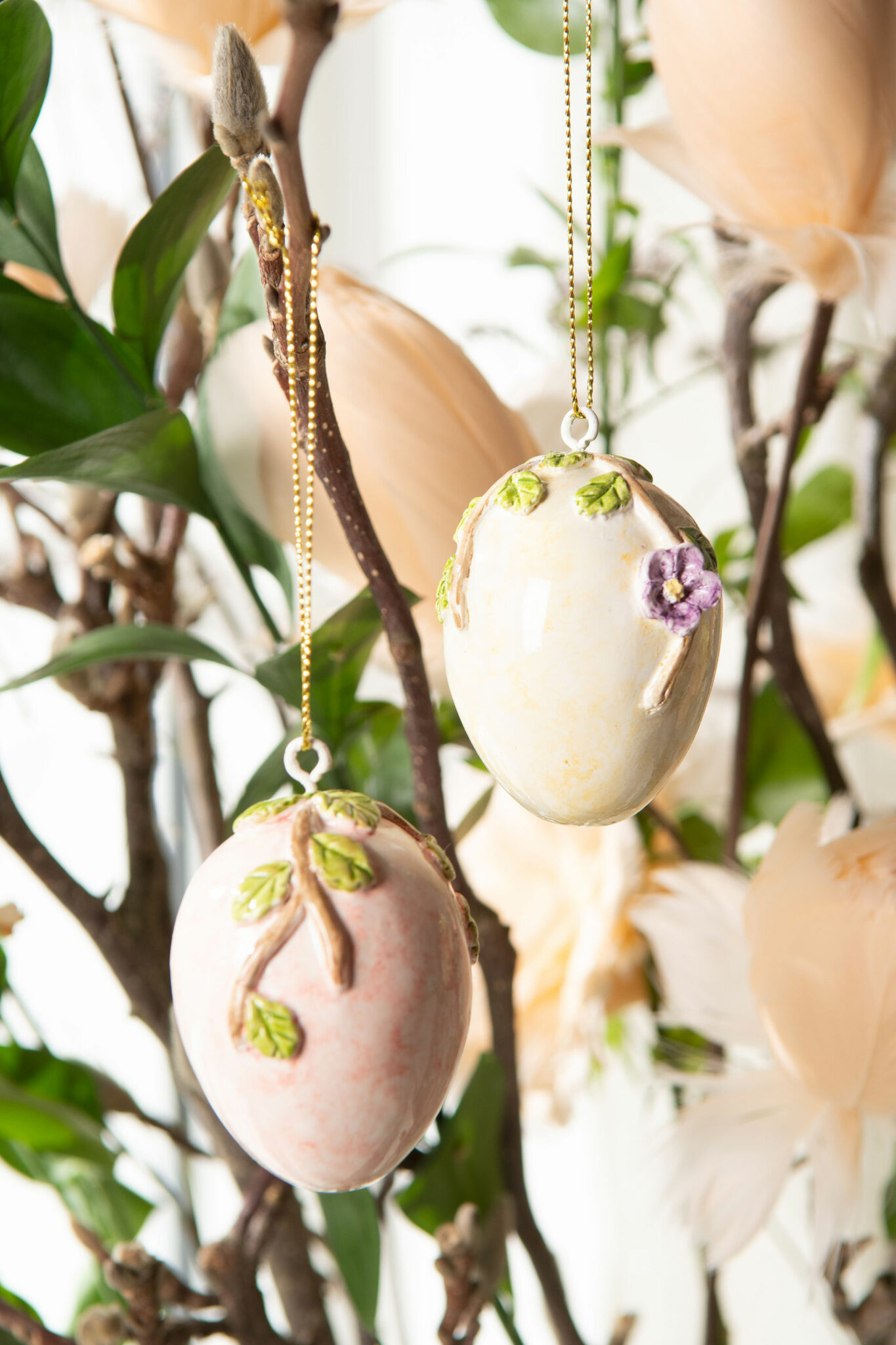 Lägstapris senaste 30 dagarna:Söta ägg att hänga i påskriset, dekorerade med gröna blad, en liten gren och blommor. Äggen kommer i 4-pack, och två ägg med ljust gul botten och 2 ägg med med ljust rosa botten.