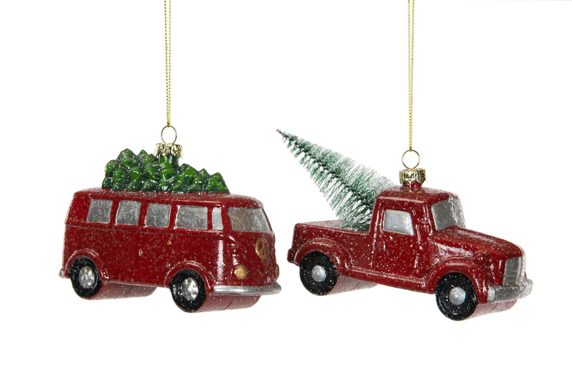 2 st julkulor i form av klassiska bilar, med gran på taket. Vackert julpynt från A Lot Decoration. Skapa julstämning med Lilla Stork!
