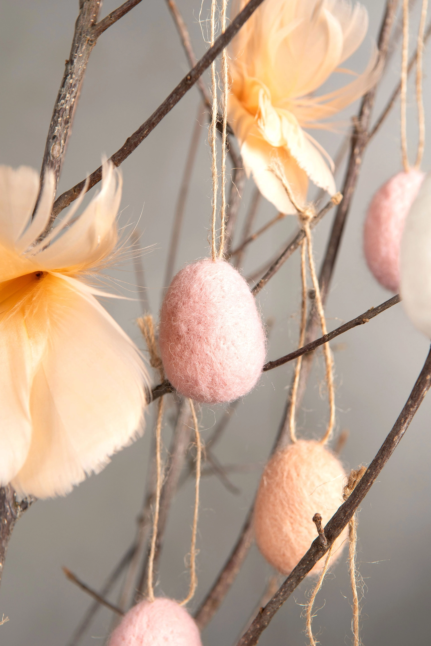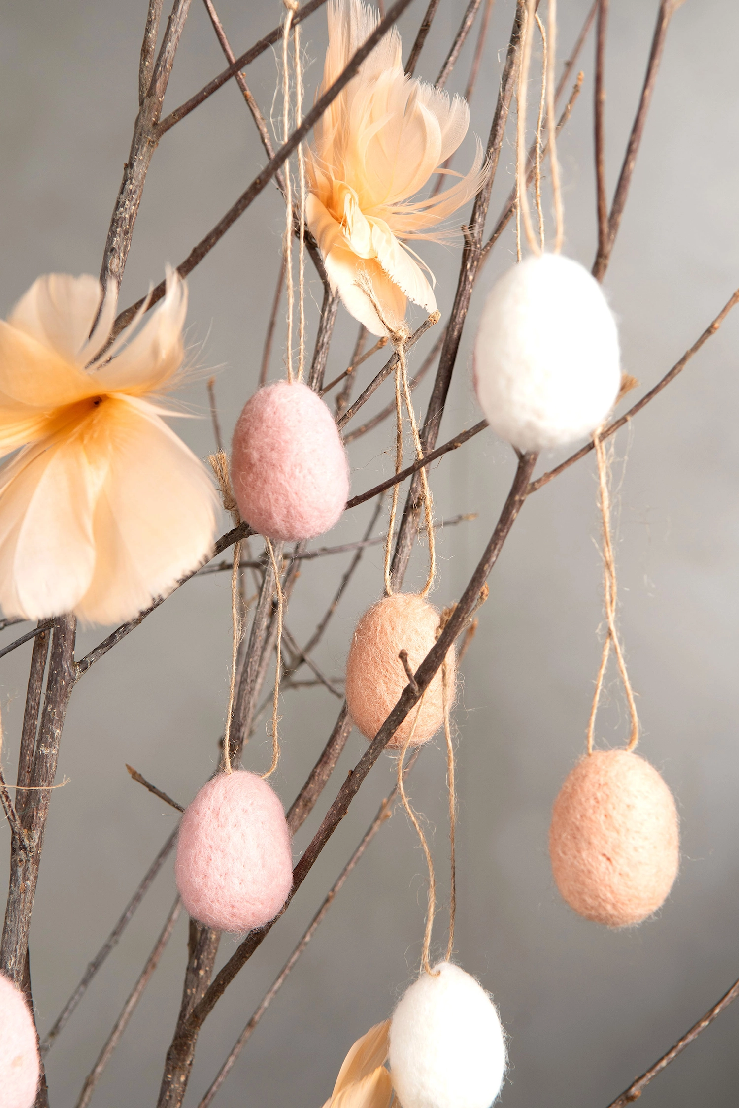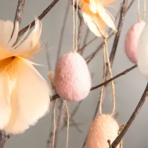 Mjuka och dekorativa handgjorda påskägg i ull, perfekta att hänga i påskriset. Äggen går i lugna pastelltoner av rosa, aprikos och vitt som skapar en harmonisk vårkänsla. Tack vare sin lätta vikt tynger de inte ned grenarna. Förpackningen innehåller 9 hängande ägg som ger ett vackert och enhetligt uttryck i din påskdekoration.