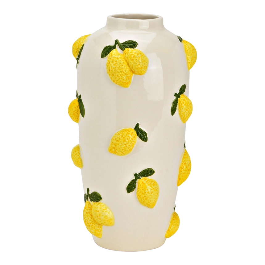Ge ditt hem en elegant och fräsch känsla med denna höga citronvas i cremevit keramik. Med sina 27 cm blir den ett stilfullt blickfång för blommor eller kvistar. De solgula citronerna ligger utanpå och ger en lekfull och harmonisk touch. Perfekt som både vas och dekorativ inredningsdetalj.