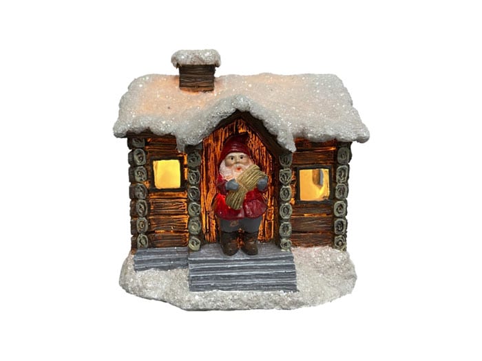 Klassisk juldekoration i form av vår fina tomte på trappan utanför sitt vinterklädda hus med snö på taket, kanske är det endast tomten som är vaken. Inne lyser lamporna med ett mjukt och varmt sken. Dessa drivs med 2 st AA batterier.