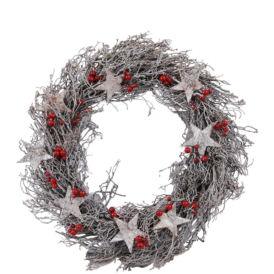 Underbar och rejäl klassisk julkrans med vitsprayade kvistar, stjärnor och röda bär. Lika fin som dörrkrans som dekoration inomhus. Diameter 45 cm.