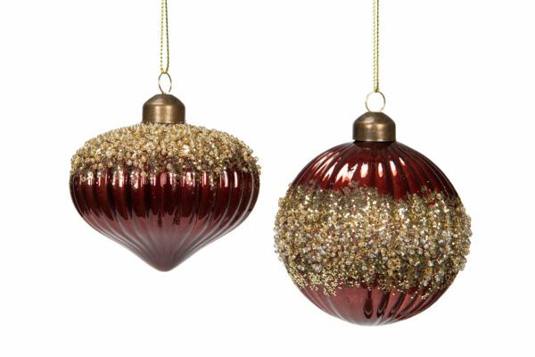 Julkula i glas i fin mörk burgundy färg med gulddekor. Två olika varianter, säljs i fyrpack, och du får två av varje sort. Fin dekoration, med bling som passar i granen, fönstret eller på annan plats som behöver piffas upp.
