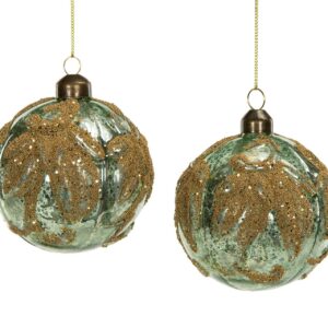 Grön julkula i glas med gulddekor. Fin dekoration, som passar i granen, fönstret eller på annan plats som behöver piffas upp. Diameter 8 cm, säljs i 4-pack.