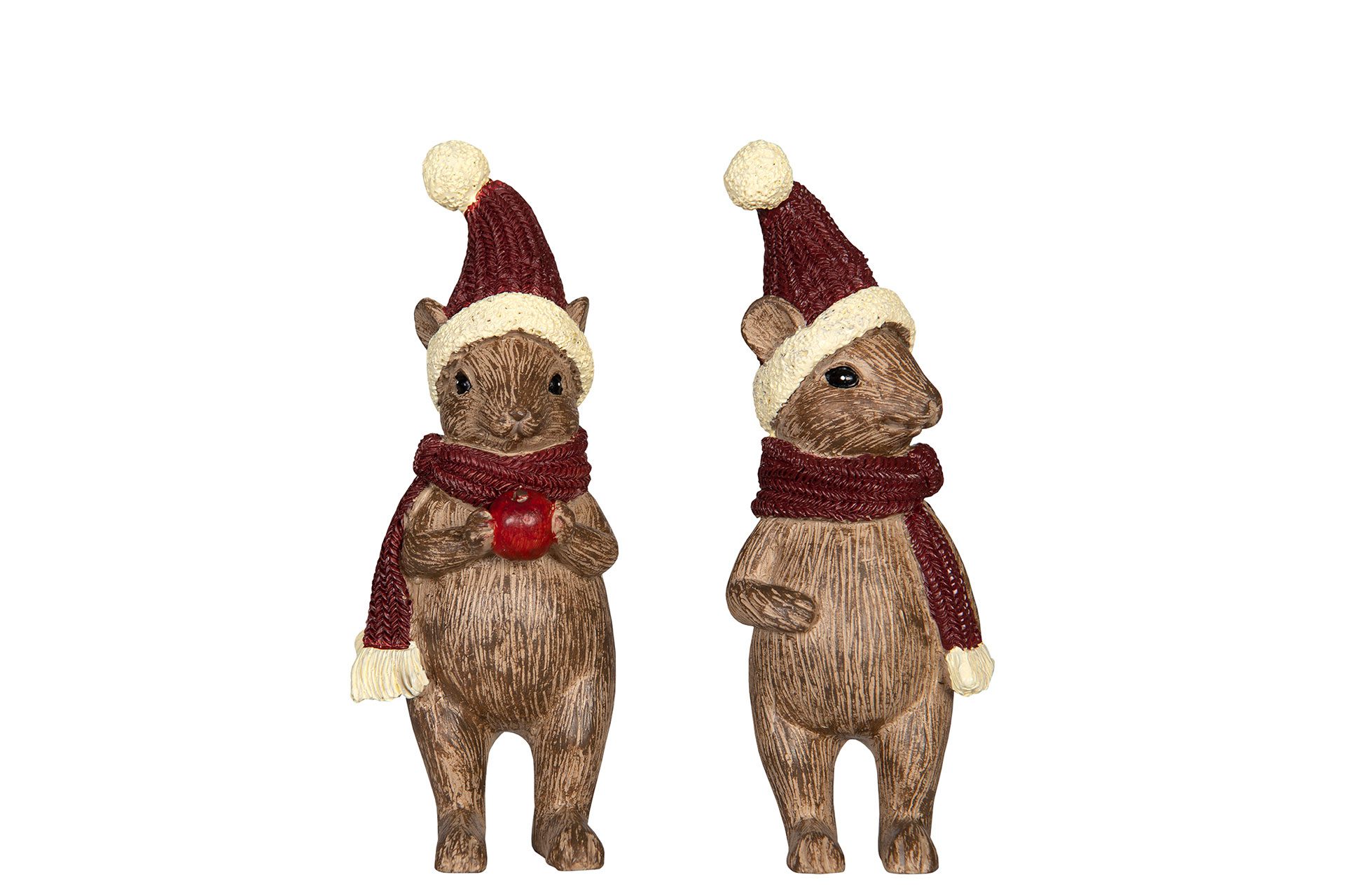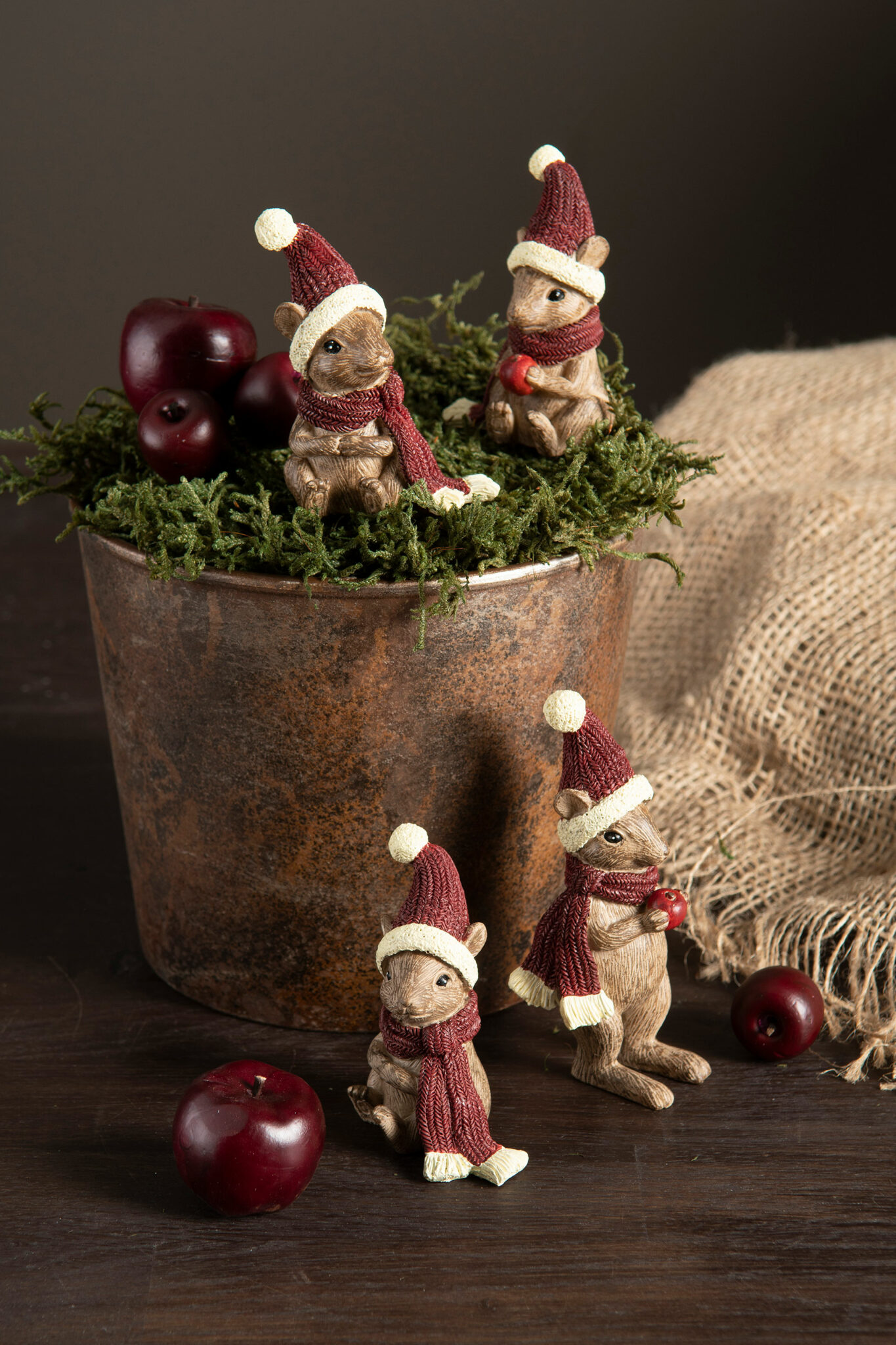 Gulligt muspar som står upp. Båda har luva och halsduk, den ena håller i ett äpple. Blir gullig dekoration på bordet, i fönstret eller i adventsljusstaken. Du köper mössen parvis, en av varje.