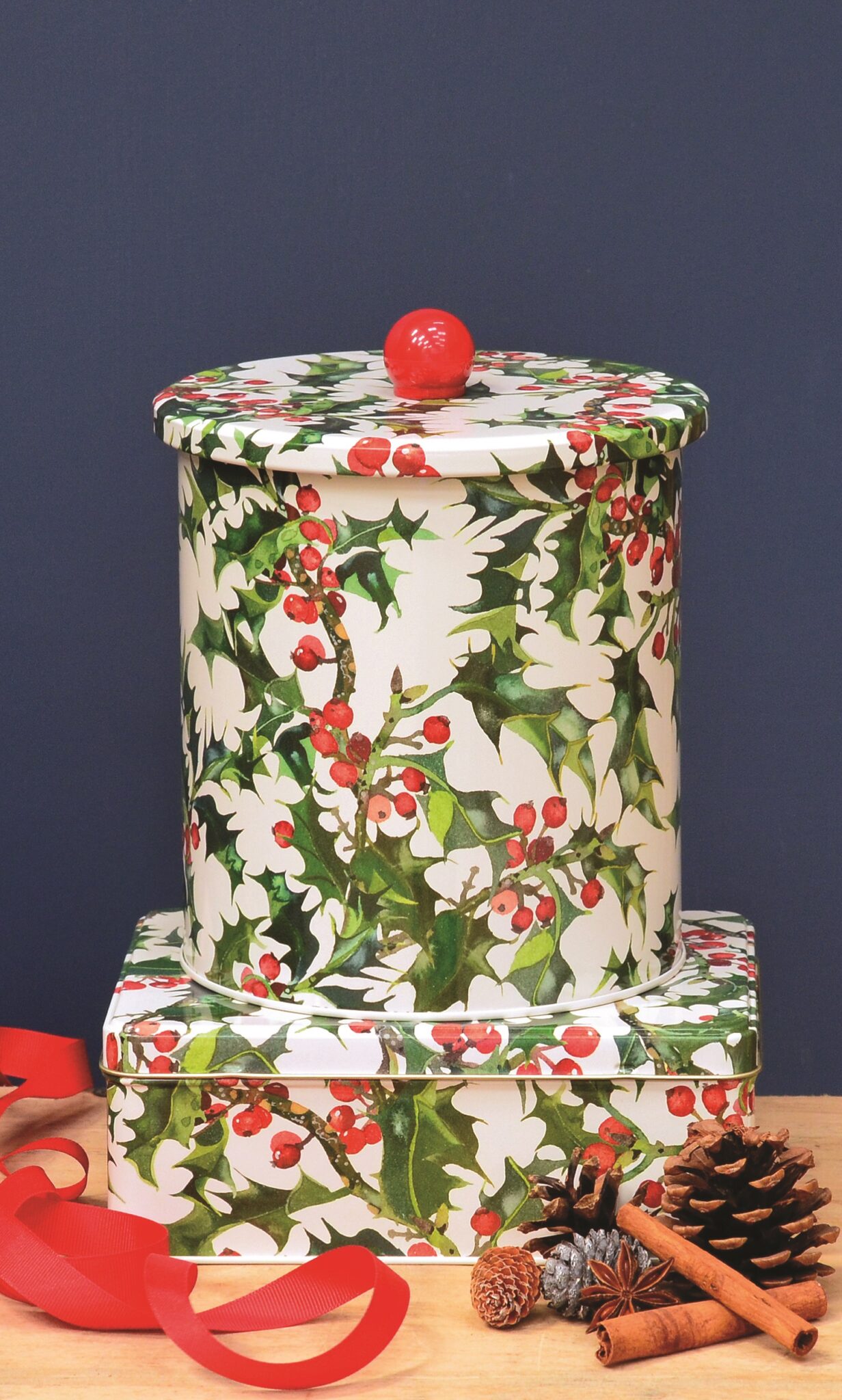 Kakburk i plåt, lock med knopp. Vackert motiv med gröna mistlar och röda bär. Här förvarar du julens kakor och får samtidigt en fin och stämningsfull inredningsdetalj i ditt hem. Storlek: Diameter 15 cm, höjd 17,3 cm.
