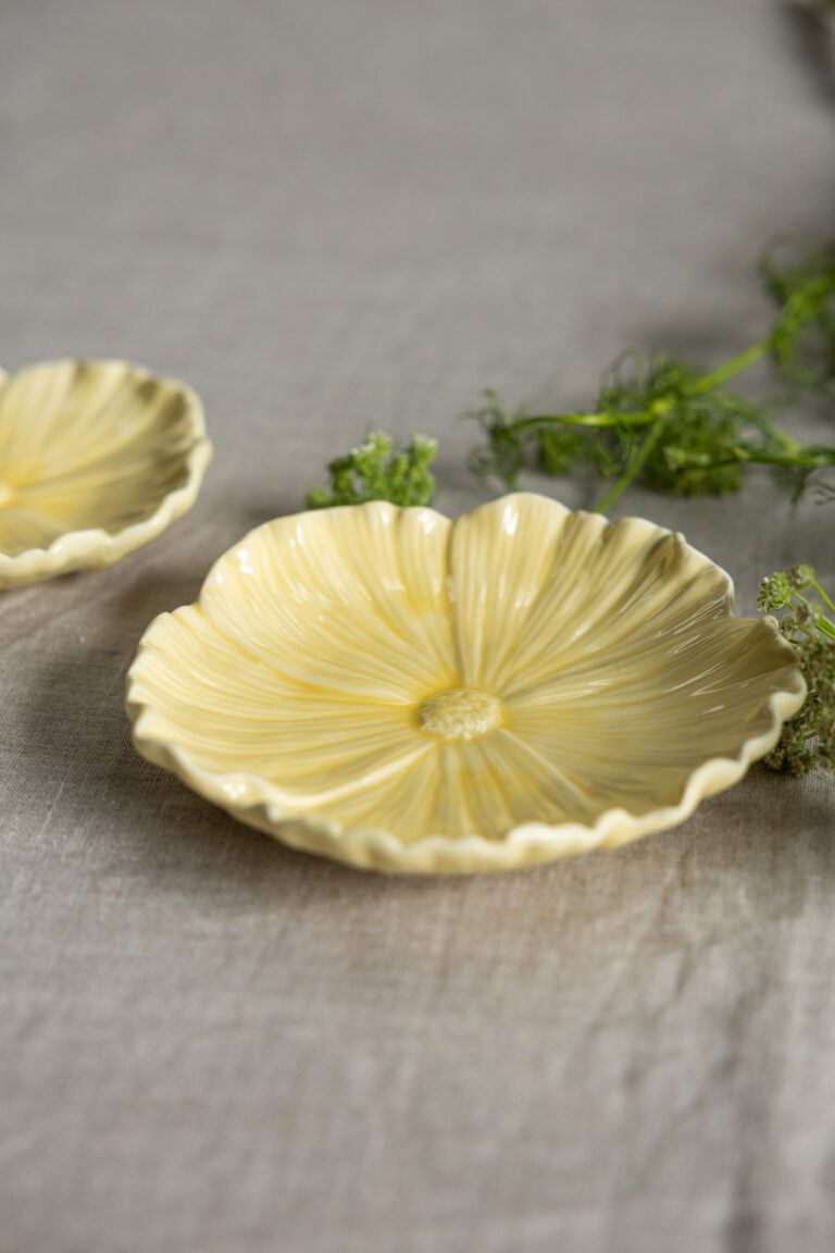 Keramikfat i form av en blomma som förenar funktion och estetik på ett elegant sätt. Det passar perfekt för snacks, smycken, när du vill duka vackert eller som en dekorativ detalj som lyfter hemmet. Varje fat är handgjort och har unika variationer i keramiken, vilket ger en genuin hantverkskänsla. För att bevara kvaliteten rekommenderas handdisk. Ett fat som vill synas!