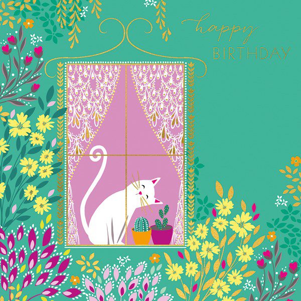 Vackert kort med kuvert från Sara Miller. Grönt kort med en katt i ett fönster i relief och foliering. Text utsida ”Happy Birthday” Mått 138 x 138 mm cm. Blank insida.
