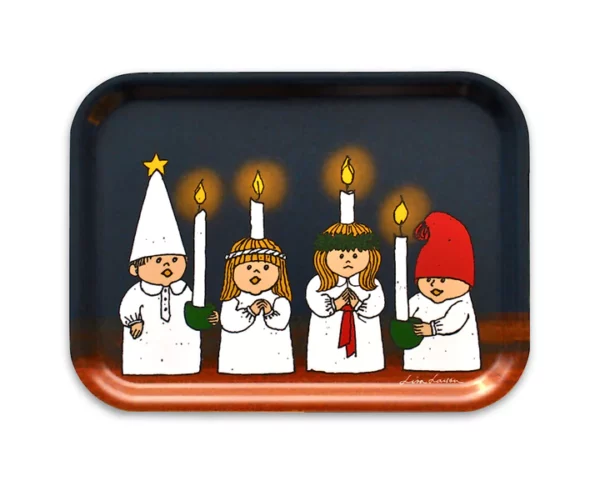 Klassiskt mönster av Lisa Larson. Bricka med gulligt luciatåg. Storlek 27×20 cm. För glögg, lussebullar och fika.