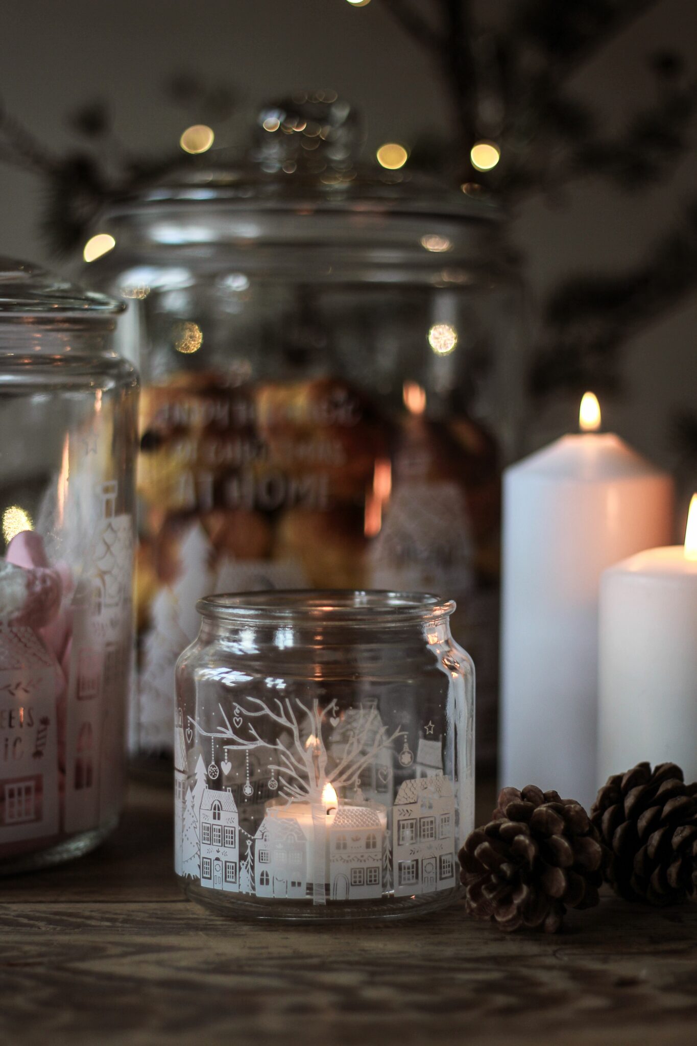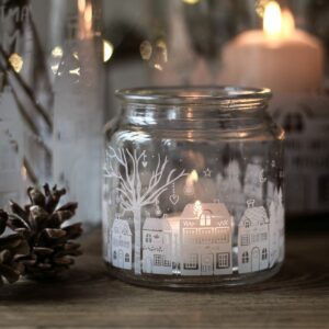 Söt ljuslykta eller liten glasburk för godis och snacks, juligt motiv med hussiluetter i vinterskrud .Du kan använda vanliga värmeljus, batteridrivet ljus till Majas fina glaslykta. Glaslykta/burk i klarglas med vitt motiv.