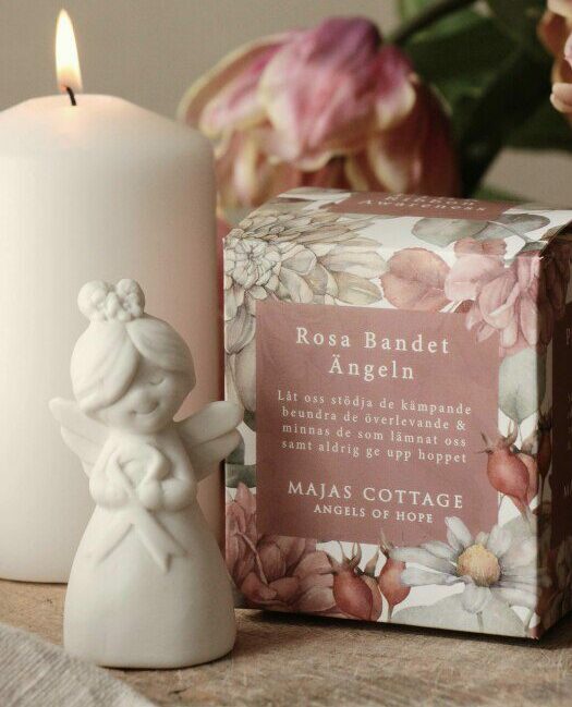 Säljs med förmån till Cancerfondens Rosa bandet insamling, vilket inte bara ger ängeln ett viktigt budskap utan den gör dessutom verklig nytta. Änglarna från Majas Cottage säljs i en begränsad upplaga.