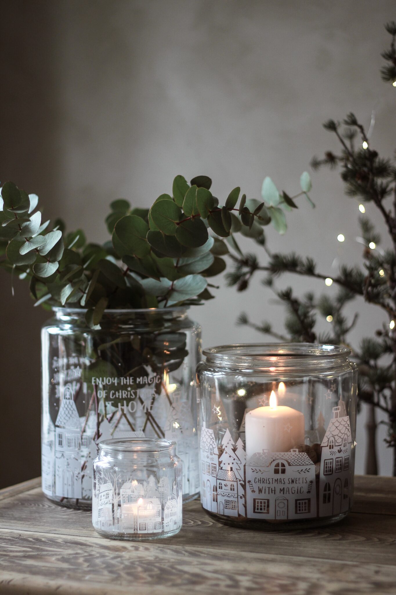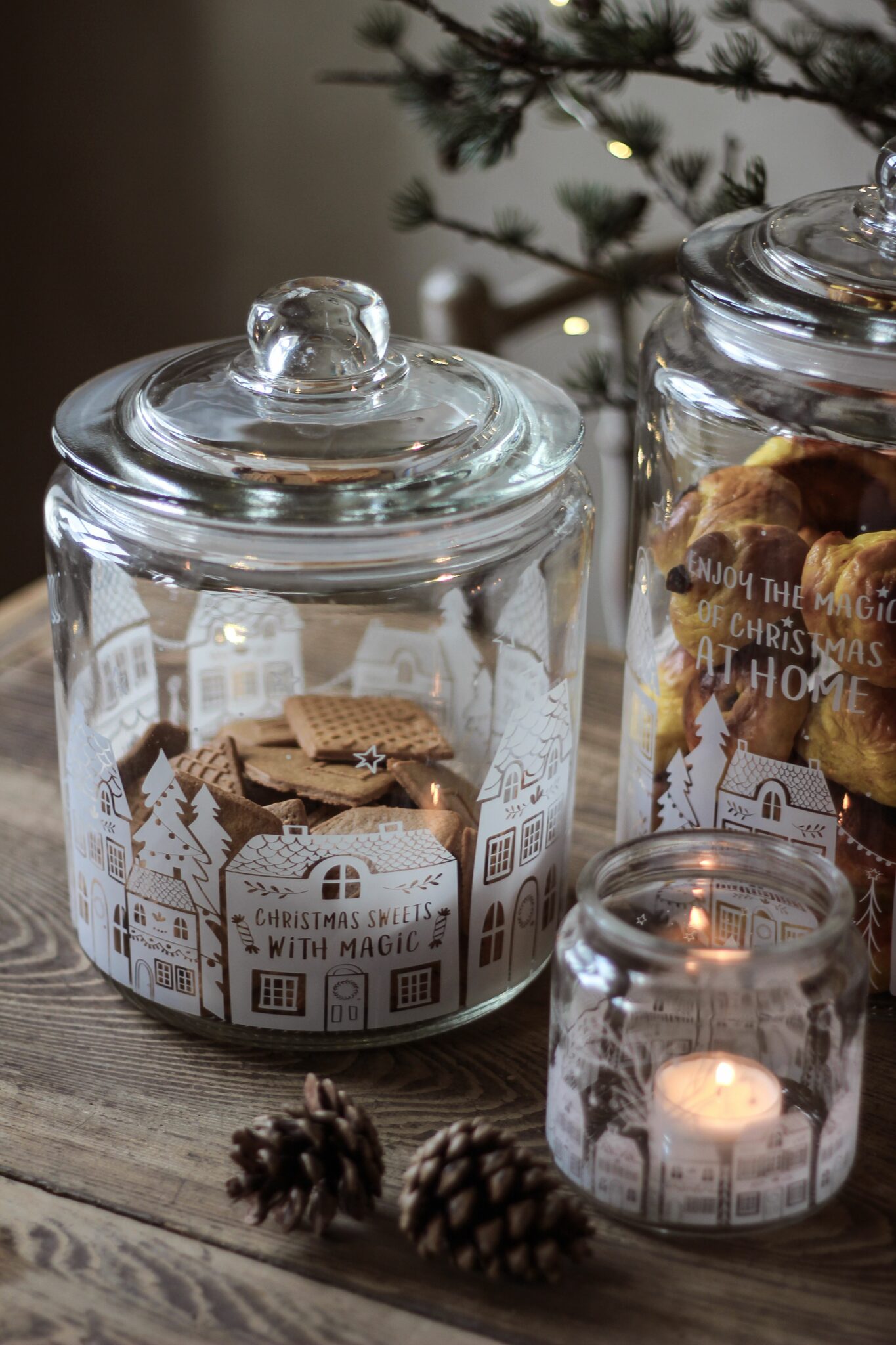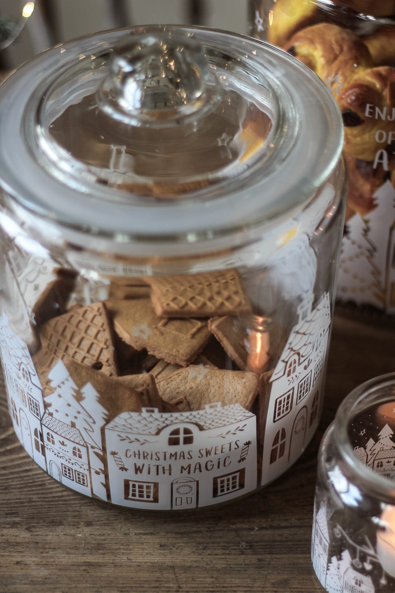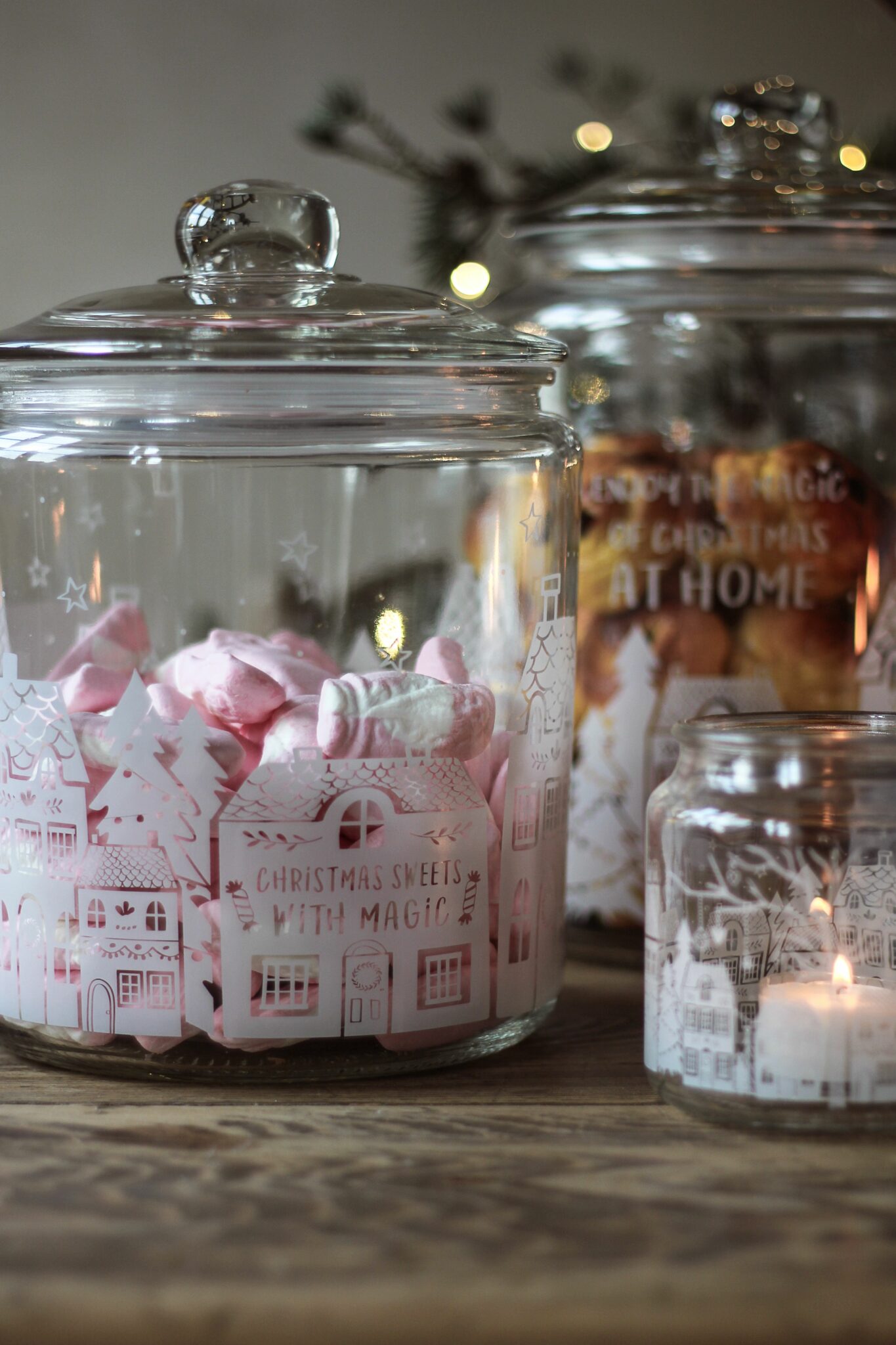 Lägstapris senaste 30 dagarna:Fin glasburk med vintrigt motiv, med stad i vinterskrud där ett av husen har texten ”Christmas sweets with magis”, Kan också användas som ljuslykta för värmeljus, blockljus, ljusslinga eller batteridrivet ljus. Glasburken är i klarglas med vitt motiv och kommer med ett tättslutande lock.