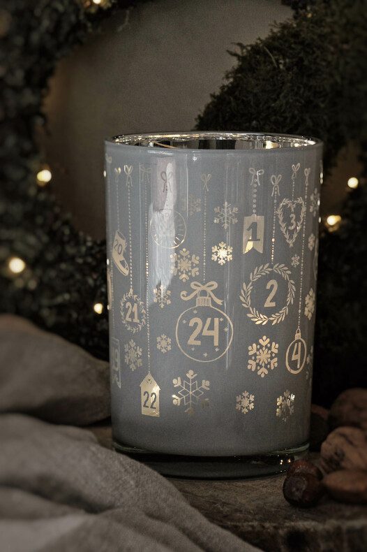 Fin ljuslykta med vintrigt motiv. Glaslykta med vit utsida och silverfärgad insida. Motiv med snöflingor, julhängen och siffrorna 1-24 som lyser stämningsfullt när lyktan är tänd. Tillverkad i begränsad upplaga och gör dessutom verklig nytta då 10% säljs med förmån till Barncancerfonden.