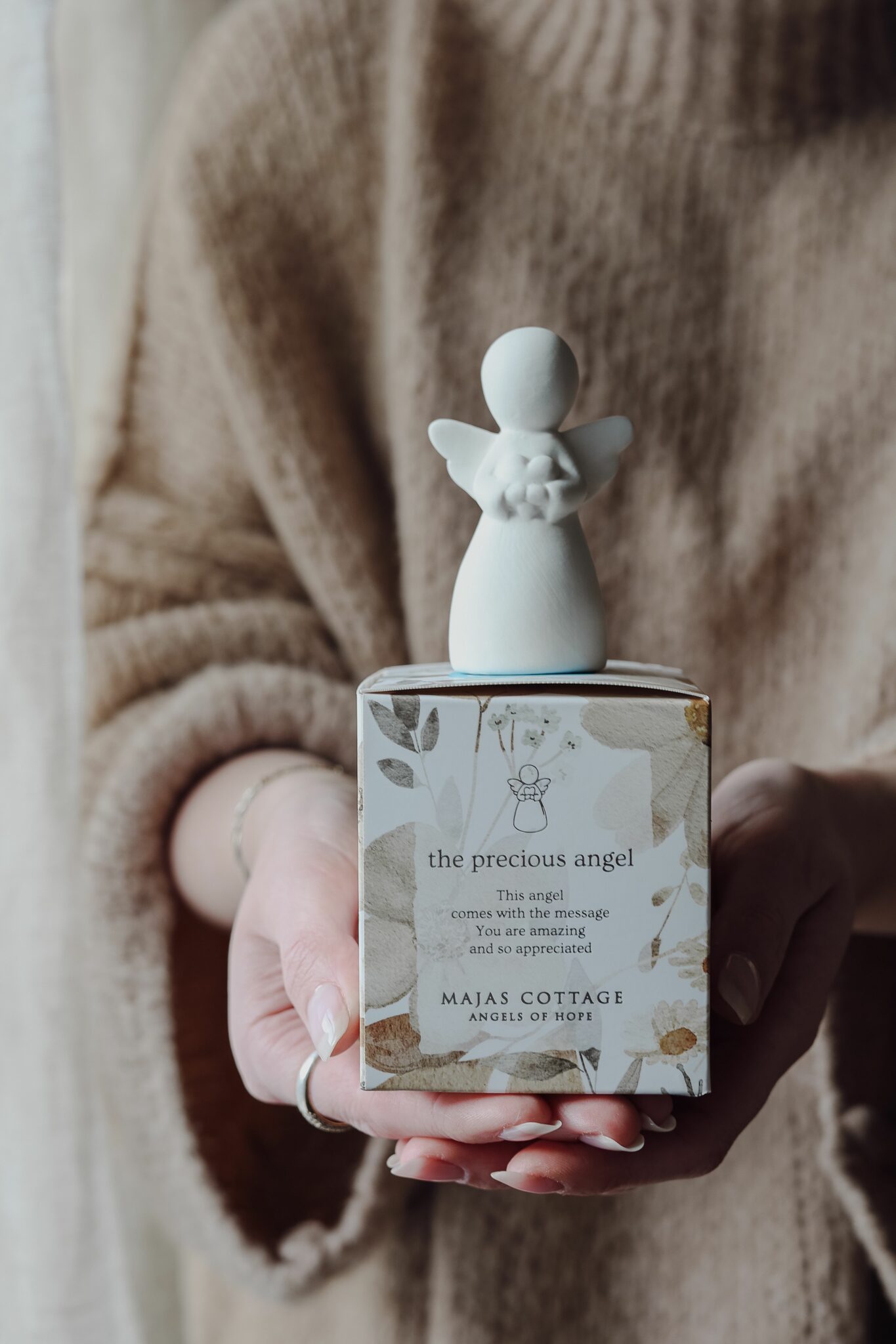 Majas Änglar är framtagna med stor kärlek och omtanke i design, budskap och känsla. Dessa änglar hoppas vi kan bringa hopp, glädje och tröst till både den som ger och får den. Denna ängel passar bra till någon som är extra värdefull i ditt liv. Säljs med förmån för Barncancerfonden, vilket inte bara ger ängeln ett fint budskap utan den gör dessutom verklig nytta. Vit ängel i matt keramik med budskapet: