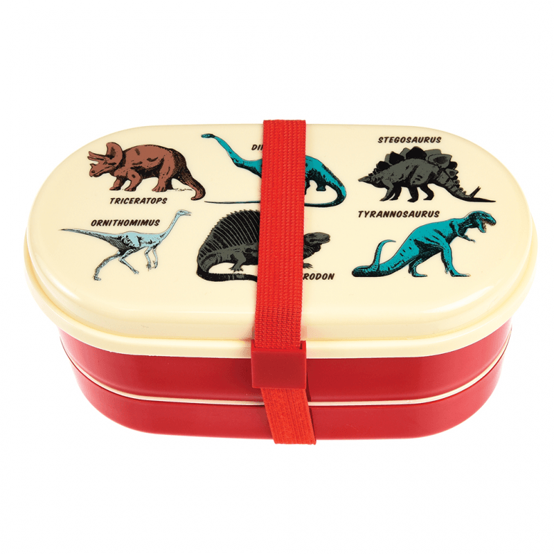 Cool matlåda med ljus botten med dinosaurier, lunchlådans underdel går i rött, liksom besticken och det elastiska gummiband som håller ihop lådan, och hindrar maten från att ramla ut.