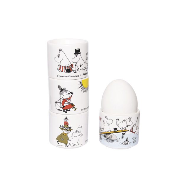 Underbara illustrationer i färg med muminfamiljen. Stapelbara äggkoppar gjorda i keramik med fyra olika motiv.