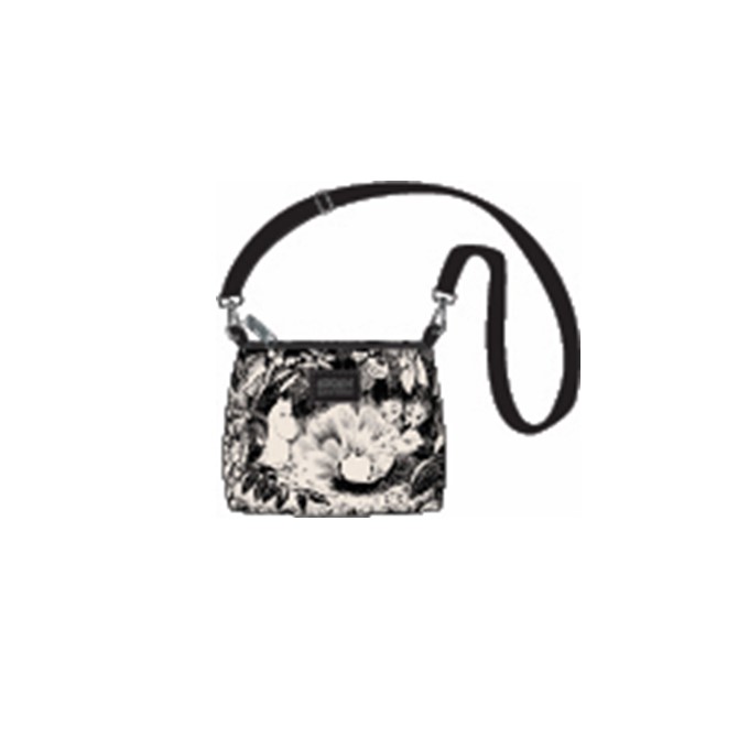 En praktisk Mumin axelremsväska i fint mönster, tillverkad i stadig polyestercanvas. Väskan har blixtlås upptill och en liten öppen ficka inuti. Den justerbara axelremmen (135 cm) är löstagbar. Detaljrik väska i med fint mönster. Metalldelarna är silverfärgade.
